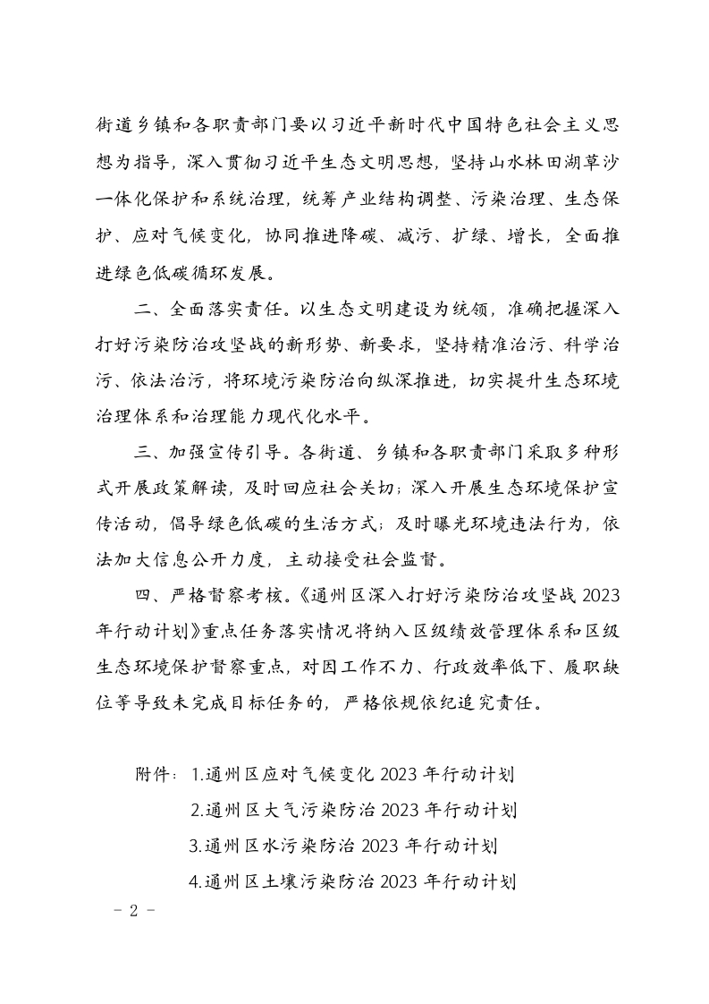 北京市通州区人民政府文件通政发[2023]4号北京市通州区人民政府关于印发《通州区深入打好污染防治攻坚战2023年行动计划》的通知各街道办事处,各乡、镇人民政府,区政府各委、办、局,各区属机构:为全面贯彻党的二十大精神,按照党中央、国务院关于深入打好污染防治攻坚战的决策部署和市委、市政府工作要求,进一步提升本区生态环境质量,经研究同意,现将《通州区深入打好污染防治攻坚战2023年行动计划》印发给你们,并就有关事项通知如下:一、切实提高政治站位。2023年是全面贯彻党的二十大精神的开局之年,是实施“十四五”规划承上启下的关键一年。各-1