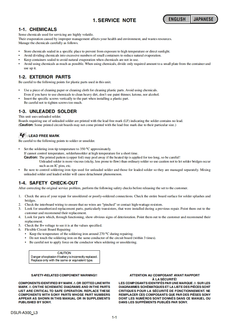 DSLR-A300SERVICE MANUALLEVEL 3AEP ModelVer.1.12008.06UK ModelRevision HistorySONYE ModelChinese ModelRevised-1Japanese Modela300Replace the previously issuedSERVICE MANUAL 9-852-277-11with this manual.LinkSERVICE NOTEPRINTED WIRING BOARDSREPAIR PARTS LISTSCHEMATIC DIAGRAMSThe components identified byLes composants identifies par unemark A or dotted line withmarkare critical for safetysont critiques pour laReplace only with part num-Ne les remplacer que par une pieceber specified.portant le numero specifie.DIGITAL SINGLE LENS REFLEX CAMERASONYDSLR-A300_L32008F0500-1m2008.69-852-277-12Sony EMCS Co.Published by Kohda TEC