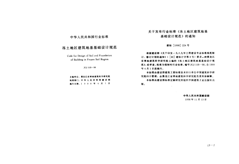 关于发布行业标准《陈土地区建筑地基中华人民共和因行业标准基础设计规范》的通知冻土地区建筑地基基础设计规范建标[1998]224号根据建设都《关于印发一九八九年工程建设专业标准规随制Code for Design of Soil and Foundation订、接订针划的通知》《[8】建标计字第8号》要求晰黑龙江of Butlding in Frozen Soal Region省摩地建氧科学研究院主编的《冻土地区建筑地基基留设计规范》,经率查,批准为强制性行业标准,编号JG)118一98,自【999jG)118-54年4月】日起施行,本标准由建设部建筑工程标准技术归口单位中国建筑科学研主编单位:黑龙红者率味电筑科学研见殿究院归口管理,由黑光江省寒胞建筑科学研究院负贵其体解释。视准部们,中华人民共和保座设都本标准由建设部标准定额研究所组织中国連氧工业出版社出行日期。1999年4月1日版。中华人民共和国建设翻1998年11月13日