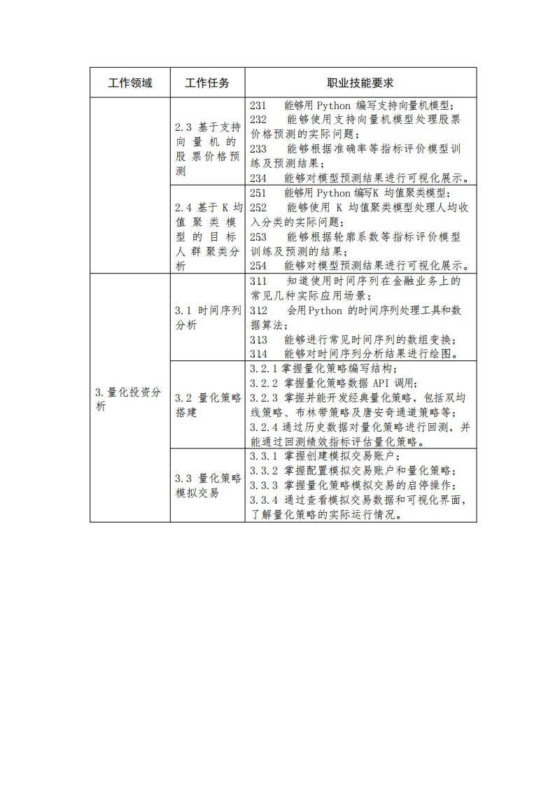 表3金融大数据处理职业技能等级要求(高级)工作领域工作任务职业技能要求1.1.1能够根据需求构建数据评估体系,对数据进行规范性评估;1.1.2能够根据需求构建数据评估体系,对数据进行完整性评估;1.1数据质量1.1.3能够根据需求构建数据评估体系,对数管理据进行及时性评估;1.1.4能够根据需求构建数据评估体系,对数据进行准确性评估;1.1.5能够确立数据质量改进目标、评估并制定改善计划,实施改进并评估改善效果。121掌握对隐私数据的加密脱敏、模糊化处理的方法,保障数据的安全运作:122能够提供数据库监控等多种数据安1.数据治理全管理措施;1.2.数据安123能够确保数据以精确和安全的方式全管理得到备份在需要进行恢复时,能完整地装回系统中:124掌握使用特定的程序对服务器进行配置,为不同用户明确定义用户数据权限的方法。1.3.1能够实现数据库与数据库之间的数据迁移:1.3数据集成1.3.2掌握数据细分管理能力,创建有意义的数管理据细分:1.3.3能够创建灵活的数据标签:1.3.4能够将数据整合进行标准统一化的管理。2.1.1能够使用Python编写一元线性回归模型2.1基于线2.1.2能够使用Python编写多元线性回归模性回归的收型;入预测2.1.3能够根据拟合度等指标评价模型训练及预测结果:2.金融数据分析2.1.4能够对模型预测结果进行可视化展示。221能够用Python编写逻辑回归模型:2.2基于逻222能够使用逻辑回归模型处理信用风辑回归的信险评估的实际问题:223用风险判定能够根据准确率等指标评价模型训练及预测结果;224能够对模型预测结果进行可视化展示。
