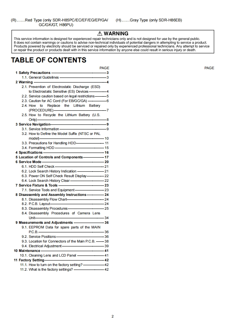 ORDER NO.VM1002009CEB27Service ManualSD/HDD Video CameraModel No.SDR-H85PDDOLBYSTEREO CREATORSDR-H85PCSDR-H85EBSDR-H85ECSDR-H85EESDR-H85EFSDR-H85EGSDR-H85EPSDR-H85GASDR-H85GCSDR-H85GKSDR-H85GNSDR-H85GTSDR-H86EBSDR-H86PRSDR-H86PUSDR-H95EESDR-H95GASDR-H95GCVOL.1Colours(K)........Black Type (except SDR-H86EB)(S)........Silver Type (only SDR-H85P/EC/EE/EG/EP/GA/GC/GK,H86PU)(A)........Blue Type (only SDR-H85P/PC/GT)Panasonic Corporation 2010.PanasonicUnauthorized copying and distribution is a violationof law.