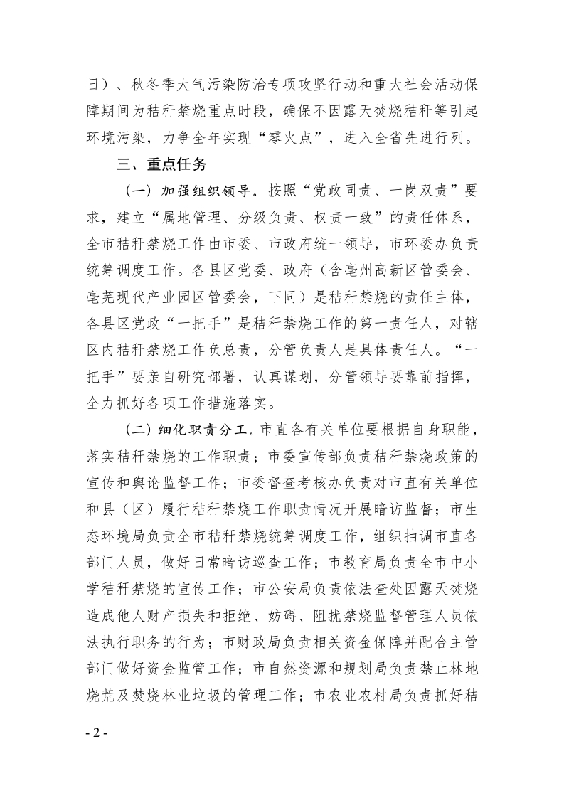 亳州市秸秆禁烧工作方案(征求意见稿)为常态化做好全市秸秆禁烧工作,根据《大气污染防治法》《安徽省大气污染防治条例》等规定,结合我市实际,制定本方案。一、总体要求深入学习贯彻习近平生态文明思想,认真落实深入打好污染防治攻坚战安排部署,按照“党政同责、分级负责、各负其责、疏堵结合、源头管控”的原则,采取常态化管理和集中攻坚相结合的模式,不断改进和创新工作方式,持续深化和巩固秸秆禁烧工作成果,坚持全域防控与重点督导相结合,全面提升秸秆禁烧工作水平,持续改善环境空气质量。二、工作目标在全市范围内对农作物秸秆(包含中药材秸秆、落叶、荒草等)露天焚烧现象实行全年全时段全区域禁烧,其中午收(5月25日至6月25日)、秋收(9月25日至10月25-1-