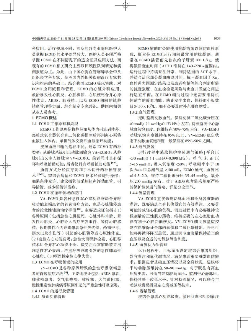 1052中国循环杂志2020年11月第35卷第11期总第269期Chinese Circulation Joumal,November,2020.Val.35a.11(Serial No.269)指南与共识不同情况下成人体外膜肺氧合临床应用专家共识((2020版)中国心胸血管麻醉学会,中华医学会麻醉学分会,中国医师协会麻醉学医师分会,中华医学会呼吸病学分会,中华医学会重症医学分会摘要体外膜肺氧合(ECM0)临床上主要用于心脏功能不全和(或)呼吸功能不全的支持,是治疗难以控制的严重心力衰竭和呼吸衰竭的关键技术。随着ECMO的跨学科应用,治疗领域不同,涉及的各专业临床医护人员掌握ECMO的水平差异较大;现有的ECM0相关研究主要以回顾性队列研究和病例报道为主。本共识由中国心胸血管麻醉学会牵头组织多学科专家,参考国内外相关疾病诊疗专家共识和指南的基础上,结合我国ECMO临床实践,对ECMO应用流程和管理,ECMO的心脏外科应用,救治暴发性心肌炎、心脏骤停、心肌梗死、急性呼吸窘迫综合征、肺移植,以及CMO期间的镇静、镇痛管理等方面进行综合制定,供国内相关从业人员参考。关键词体外膜肺氧合:心力衰竭:呼吸衰竭:镇静:镇痛Expert Consensus on the Clinical Application of Adult Extracorporeal Membrane Oxygenation UnderDifferent Conditions (2020 Edition)Chinese Society of Cardiothoracic and Vascular Anesthesiology,Chinese Society of Anesthesiology,Chinese Association ofAnesthesiologists.Chinese Thoracic Society.Chinese Society of Critical Care Medicine.Corresponding Author:MIN Su,Email:ms89011068@163.comAbstractExtracorporeal membrane oxygenation (ECMO)is a key technology for the treatment of severe heart failure andrespiratory failure that are difficult to control with conventional strategies.With the interdiscipl inary application of ECMO andthe use in different treatment fields,the level of ECMO mastery among the involved professional clinical medical staffs variesgreatly;the existing ECMO-related studies mainly focus on retrospective cohort studies and case reports.This consensus isinitiated by the Chinese Society of Cardiothoracic and Vascular Anesthesiology,discussed and written by multidisciplinarydomestic experts,consensus experts referred relevant domestic and foreign consensus and guidelines,summarized experienceof domestic ECMO clinical practice,the application process and management of ECMO,the application of ECMO in cardiacsurgery,and the treatment of outbreaks comprehensive fommulations for myocarditis,cardiac arrest,myocardial infarction,acute respiratory distress syndrome,lung transplantation,and management of sedation and analgesia during ECMO.We hopethis consensus would be helpful as a reference tool for relevant domestic ECMO practitioners.Key words extracorporeal membraneoxygenation;heart failure;respiratory failure;sedation;analgesia(Chinese Circulation Journal,2020,35:1052.)体外膜肺氧合(ECMO)作为一种重要的体外生和演变,现今ECMO的适应证更加广泛,已在心脏命支持技术,临床上主要用于心脏功能不全和(或)外科手术、暴发性心肌炎、心肌梗死、心脏骤停、呼吸功能不全的支持,目前已经成为治疗难以控制急性呼吸窘迫综合征(ARDS)以及心肺器官移植等的严重心力衰竭和呼吸衰竭的关键技术1-。20世多个领域开展,并取得了一定的效果。近年来国纪60年代ECM0于国外开始应用于临床,20世纪内外已经相继发布了ECMO技术方面和单项疾病应末国内临床上成功开展ECMO。随着ECMO的发展用的专家共识和指南B-。然而随者ECMO的跨学通信作者:闵苏Emi止m89011068@163m中图分类号:R54文献标识码:C文章编号:1000-3614(2020)11-1052-12D0L1039%9i=n1000-3614.202011.002