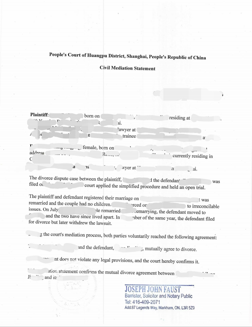 AFFIDAVIT1,WUWEN GUO,translator in the City of Toronto,Province of Ontario,makeoath and say:1.I am fluent in both Chinese and English.2.I have translated the annexed document and carefully compared thetranslation from Chinese into English with regard to the followingdocument:Civil Mediation Statement3.The said translation is,to the best of my knowledge and ability,thecomplete and correct translation of said document.SWORN before me at the City of TorontoIn the Regional Municipality of MetropolitanToronto九This day of o,2024iA Notary Public in and for theWUWEN GUOProvince of OntarioJOSEPH JOHN FAUSTBarrister,Solicitor and Notary PublicTe:416-409-2071Add:87 Legends Way,Markham,ON.L3R 529