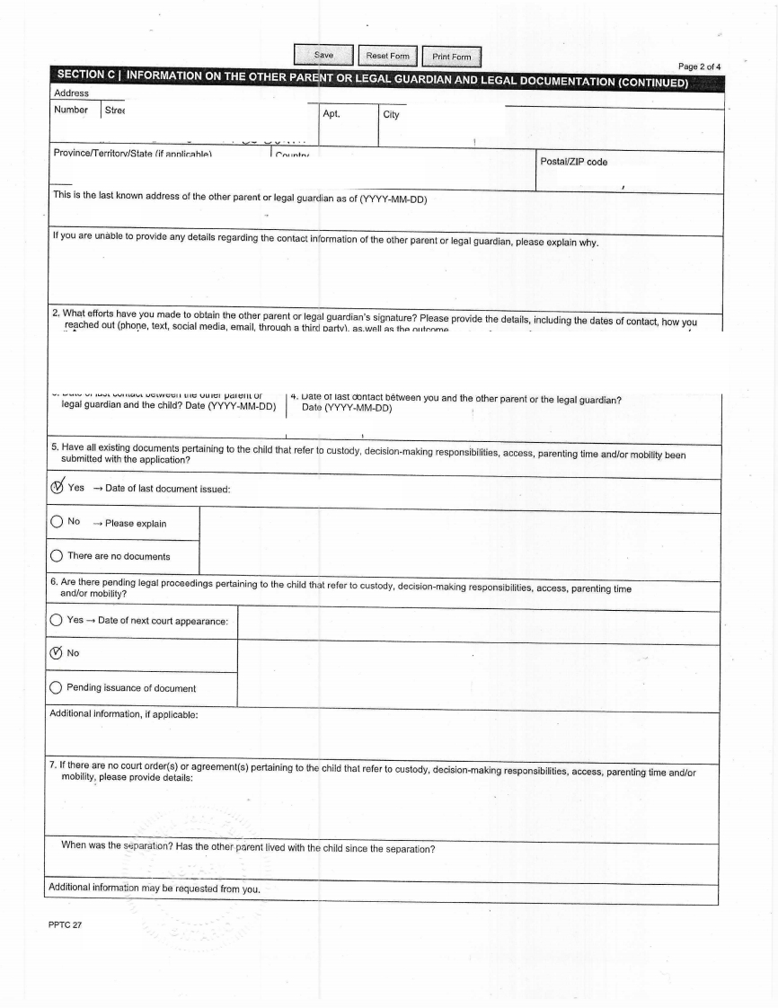 圆◆魔GovernmentGouvernementof Canadadu CanadaSaveReset FormPrint FormPROTECTED WHEN COMPLETED-BPage 1 of 4STATUTORY DECLARATION-OTHER PARENT OR LEGAL GUARDIAN:Whereabouts Unknown or Refusal to Sign the Child's Travel Document ApplicationWARNING-Any false or misleading statement on this form or relating to any document in support of this application,including concealmentof any material fact,may lead to refusal or revocation of a Canadian travel document.IMPORTANT-This statutory declaration should only be used when:☑the current whereabouts of the other parent or legal guardian is unknown;the acknowledgment from the other parent or legal guardian is required but they refuse to sign the application form.This statutory declaration cannot be used when the parents or legal guardians share custody or decision-making responsibility.INSTRUCTIONSThe applicant parent or legal guardian must complete and sign a separate form for each child's passport application under oath or by solemn declaration in thepresence of a person who,by law,is authorized to administer an oath or a solemn declaration.If the declaration is completed outside Canada,a qualifiedofficial includes a Canadian diplomatic or consular representative or a local official.When no documentation pertaining to the child that refers to custody,decision-making responsibilities,access,parenting time and/or mobility exists:Please complete all sections.In all other situations:Please complete Sections A,B,C,E and F.Failure to complete all the required sections of this form will result in your application being rejected.Type or print in CAPITAL LETTERS using black or dark blue ink.SECTION A|CHILD'S PERSONAL INFORMATIONChild's surname(last name)Child's given name(s)Child's date of birth(YYYY-MM-DD)Child's Place of birthCityProvince/Territory/State (if applicable)CountrySECTION BI APPLICANT PARENT'S OR LEGAL GUARDIAN'S PERSONAL INFORMATIONSurname (last name)Given name(s)SECTION CI INFORMATION ON THE OTHER PARENT OR LEGAL GUARDIAN AND LEGAL DOCUMENTATION.If insufficient space to provide all of the required information,attach a separate signed and dated sheet of paper.1.Other parent's or legal guardian's informationPlease provide the last known contact information of the other parent or legal guardianNote:Your contact information will not be disclosed to this other parent.Surname(last name)Given name(s)Telephone (davtime)Telephone (cell)Email addressPPTC(DISPONIBLE EN FRANCAIS-PPTC 279 F)Canada