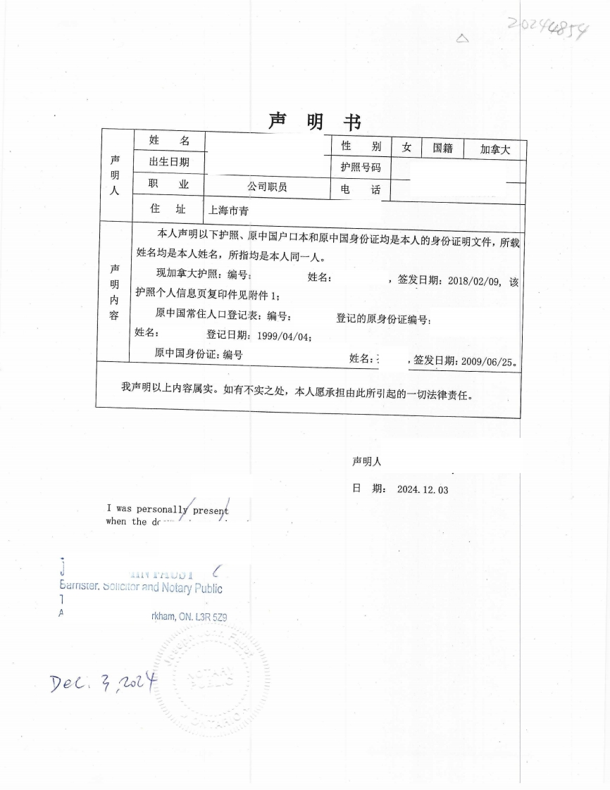 OntarioMINISTRY OF PUBLIC AND BUSINESS SERVICE DELIVERYMinistere des Services au public et aux entreprisesAPOSTILLE(Convention de La Haye du 5 Octobre 1961)1.Country:Pays:CanadaThis public document Le present acte public2.has been signed by a ete signe parJO3.acting in the capacity of agissant enNotary Publicqualite de4.bears the seal stamp of/est revetu duNotary Publicsceau /timbre deCertifiedAtteste5.at/aToronto,Ontario6.the/1e2024-12-177.by/parManager Official Documents Services8.N°/sous nON-24-9.Seal stamp sceau/timbre:10.Signature signatureThis Apostille only certifies the signature,the capacity of the signer,and,where appropriate,theseal or stamp it bears.It does not certify the content of the document for which it was issued.CetteApostille atteste uniquement a veracit de la signature,a qualitn laquelle le signataire de ractea agi et,le cas cheant,I'identite du sceau ou tmbre dont cet acte est revetu.Elle ne certifie pas lecontenu du document pour leguel elle a ete emise..This Apostille is not valid for use anywhere within Canada.L'utilisation de cette Apostille n'est pasvalable au Canada..If this document is to be used in a country which is not party to the Hague Convention of 5October1961.it may need to be legalized by a consular office of the country of destination.Si ce documentest destine a un pays non partie a la Convention de La Haye du 5 octobre 1961,il pourrait necessiterun lgalisation par un consulat du pays de destination.To verify the issuance of this Apostille,see [www.officialdocuments.mgcs.gov.on.ca/en-US/validity-check/].Cette Apostille peut etre verifiee a I'adressesuivante[https://www.officialdocuments.mgcs.gov.on.ca/r-FR/validity-check/
