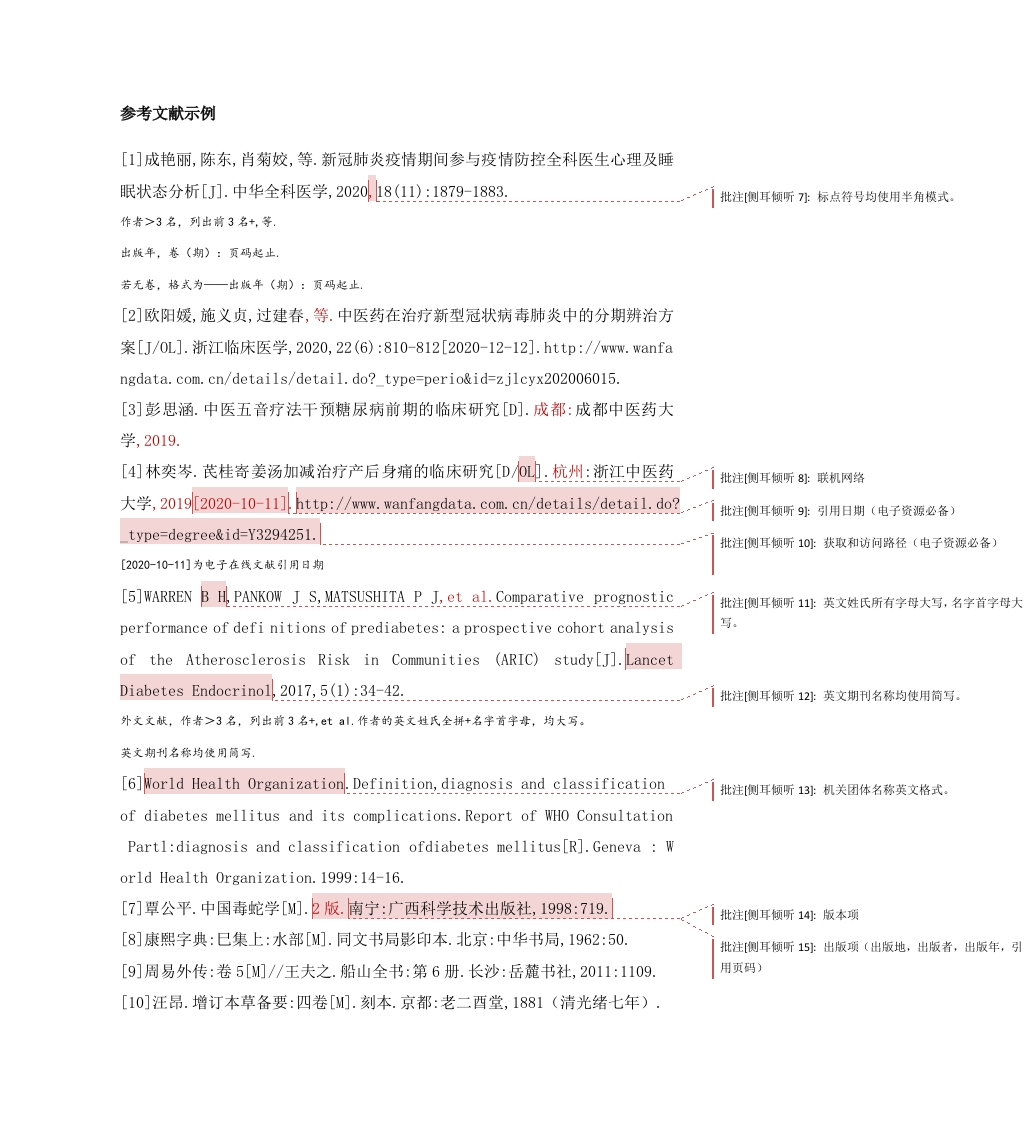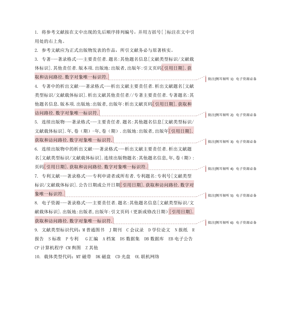 1.将参考文献按在文中出现的先后顺序排列编号,并用方括号[]标注在文中引用处的右上角。2.参考文献应为正式出版物发表的作品,所引文献务必与原著核实。3.专著-一著录格式一主要责任者.题名:其他题名信息[文献类型标识/文献载体标识].其他责任者.版本项.出版地:出版者,出版年:引文页码[引用日期].获取和访问路径.数字对象唯一标识符批注[侧耳倾听1小:电子资源必备4.专著中的析出文献一著录格式一析出文献主要责任者.析出文献题名[文献类型标识/文献载体标识].析出文献其他责任者/专著主要责任者.专著题名:其他题名信息.版本项.出版地:出版者,出版年:析出文献页码[引用日期].获取和访问路径.数字对象唯一标识符批注侧耳倾听2小:电子资源必备5.连续出版物-一著录格式-一主要责任者.题名:其他题名信息[文献类型标识文献载体标识].年,卷(期)-年,卷(期).出版地:出版者,出版年[引用日期].获取和访问路径.数字对象唯一标识符批注[侧耳倾听3:电子资源必备6.连续出版物中的析出文献-一著录格式-一析出文献主要责任者.析出文献题名[文献类型标识/文献载体标识].连续出版物题名:其他题名信息,年,卷(期):页码[引用日期].获取和访问路径.数字对象唯一标识符.批注侧耳倾听4小:电子资源必备7.专利文献一著录格式一专利申请者或所有者.专利题名:专利号[文献类型标识/文献载体标识].公告日期或公开日期引用日期].获取和访问路径.数字对象唯一标识符批注[侧耳倾听5:电子资源必备8.电子资源-一著录格式一主要责任者.题名:其他题名信息[文献类型标识/文献载体标识].出版地:出版者,出版年:引文页码(更新或修改日期)[引用日期].获取和访问路径.数字对象唯一标识符.批注[侧耳倾听6小:电子资源必备9.文献类型标识代码:M普通图书J期刊C会议录D学位论文N报纸R报告S标准P专利G汇编A档案DS数据集DB数据库EB电子公告CP计算机程序CM舆图Z其他10.载体类型代码:MT磁带DK磁盘CD光盘OL联机网络