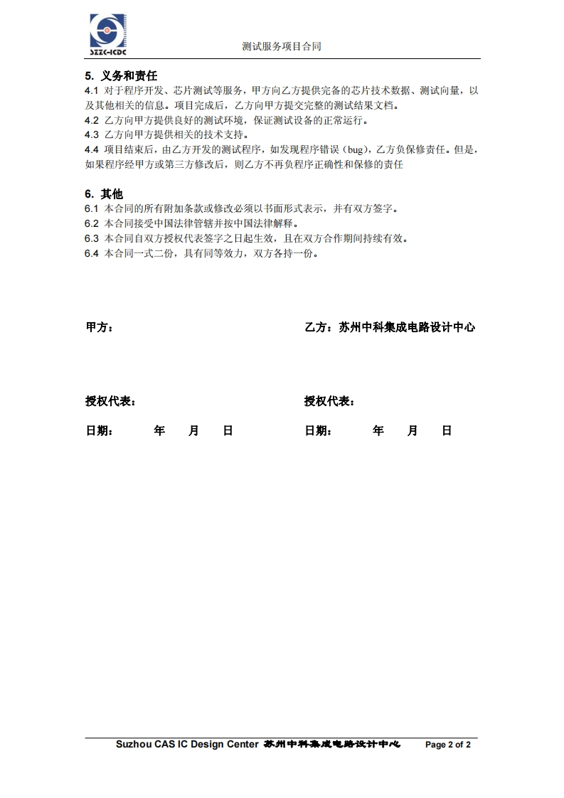 测试服务项目合同SZZC-ICDC测试服务项目合同合同号:SZIcc-TC-20xx-T-xx甲方(客户方):地址:乙方(服务方):苏州中科集成电路设计中心地址:苏州市工业园区金鸡湖大道1355号国际科技园二期E3011.服务内容·测试程序开发:·芯片测试:·DIB制作:·ATE机时租赁:离线开发环境机时租赁:2.保密信息2.1本项目特定的保密信息如下。甲方提供:·器件规范:测试需求:测试向量:·器件测试电路图:乙方提供:·项目计划:测试规范:测试程序:DB设计规范:DB电路图:DIB Layout::·测试结果文档:2.2项目的保密约定参见双方所签订的《测试服务保密协议》。3.知识产权由乙方开发的测试程序和DB板,双方共享其知识产权。4.服务收费Suzhou CAS IC Design Center苏州中科率减电路设计中心Page 1 of 2