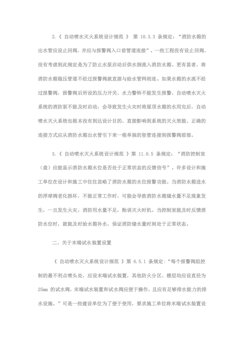 常见自动喷水灭火系统存在问题初探自动喷水灭火系统一般由洒水喷头、报警阀组、水流报警装置、管道、供水设施等组成。该系统是最常见的水灭火系统,扑救初期火灾十分有效,因此得到了非常广泛地运用。笔者在日常工作中,发现一些建筑物的自动喷水灭火系统设计以及施工中存在诸多问题,它们不仅影响到系统的可靠性,更影响到建筑物的使用安全。下面就工作中发现的这些问题,与大家作一些探讨。一、关于消防水箱设置1.《自动喷水灭火系统设计规范》第5.0.1条规定:“系统最不利点处喷头的工作压力不应低于0.05脚a”。这就要求消防水箱与距离最不利点喷头的垂直高度不低于5m,一些建筑工程没有设置增压措施,就是没有考虑此规定。应该设置增压水泵和稳压罐确保在供水泵启动前供给启动初期的水压:而在实际施工中,有些工程将增压水泵出水管作为消防水箱的出水管,这是非常错误的做法。这是因为,设置增压水泵的主要目的是在火灾初期消防水泵启动前,满足消火栓和自动喷水灭火系统的水压要求,其出水量对消火栓给水系统不应大于5L/s,对自动喷水灭火系统不应大于1L/s,显然大大小于规范要求的室内消防用水量,不能满足扑救初期火灾水量的要求。所以,在屋顶设置的增压水泵,应在增压水泵出水管一侧设旁通管,出水流量不应小于扑救初期火灾需要的用水量。