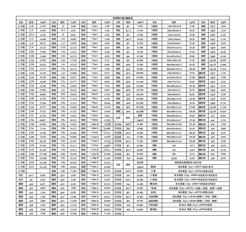 意用围理论重量表格名欧域格KaM名规格Kz/M名线格Kz/2缓格Kz/M名规格Ka/M工011216540L254149I75010x507xl031.90Dtls120工213.9871636634L3041涵Ls11.802000081250.50De201530工2614223805L4042A22215700248xl24582580D:252430工416890110000可L053002519屈0250l256929.70Dt323.130工620.5311220L到64465323.550202509x147240D:403840工24.1012623区L5542543140025025514148220解管D:9480工2027.929【4a4535L0654D539250294108x25730D:76540工2310分I466JL国54822647.10029402x12x128500D:808340工233070【l6a720L因6572486200300106.593730D:loo1080工24365241169J望L706640s-107890030030010159450D:l255D0工2374刀因a20174L07738钢板12943103003051515I0600Dyl9780工20412451823000L0883314109900302509x479.70DelsL.30工23810611a226刀L756690s1625600344348101615mD:2L.700工2年4203012a2517L7589030184130030x17s7x115000Dt252.530H座钢工2,43492122a2499用L06737%2057000390300101610700D:32320工2是478图122L0896级22人72.7039%x9%7x115670被锌D:40400工30480841246306丛L8x1011874259%3004003108x36600管D:95100工字工352.794情钢125aL90683028219800440300x11xl☒2400D:76930钢T3057504125L3引335角钢L9081096人302B55004903009x147650D:80器70工352.77I25e352090xl01347632251200482300x1川x5150D:loo1L340工357.740【sa3引AD90x121590362s260088300x11×区2900Dals因60工3462.765【2s6358四L00693伍N规格菱形0020010168950208图名称T36600打Ie4029L100.81227%KaA280012x1737004L20工3生656图130%344图L100x01512D8-2521800830012205L00461.50工3在7L34130地粉13L100x121789题8-3250096d99%101s9s108200m工406759图13e408%L1I0813532&-3529.①000200xIx7I060020240蝶议工4738832a3数图L10x016690&m4334002003001324850022.90花效钢工4080.1型132401WL10×219724.53730070030013241因5002538幻工498748532e轻13引L25815504人342.30038K3煜32器4830工49450136a84L1250191855463004阳K4465的263011三10836bL125x22269%65s0.00解轨9OK5L161.990工5623.900136e59.118L14x10214图&-86600QL8O63用40980工6312图10a8928L10x22552名称规格鼻豆形朋材理论重量慎琴计草方法T63e4L.1910地65204L140x429490Ka/M2蓝服E每米重量区:】-062x直径x直径【0e14图L10x6333图-252200方管:每米重量K,)■085边宽边宽的505025380L10x229391&-326800六角图:每米重量K)006x对边直径时边直径80.39530550L10x4339883530.900八角丽:每米重量区)-006对边直径时边直径0067议630L10x6385图&m434400气这报:每米重量K:】-006d0直径d0直径20图83新7990L10x43054338300·角图:每米重量Kg),m85(边宽+边宽.边厚)边厚喇4花纹1210◆098刀L180x1643542板542300低钢良钢:每米重量Kg)■00及5厚皮边夜61.到0望1L.990L10x☒48634Fss46310钢无健相管:每米重量区,)■266来×《(外经来厚)】48200052A40L200x164860650.l00接缝钢管:每米重量Kg)■2畅6壁厚x(外经壁厚)202400松1420L-200x1区5440N&-86500中厚钢板:每米m2重量Kg)-0085厚度222.5015A3DL-203060D务-86500辣钢板:每米m2重量区g)■00786厚度243.509300L-20024711图