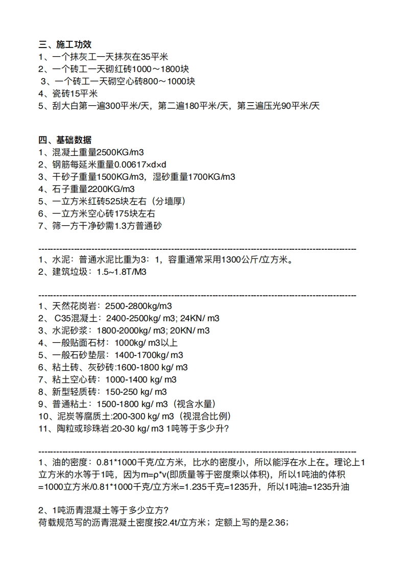 常用工程造价理论数据表一、砖计算每块砖的体积(240*115*53)=0.00146立方米(毛耗用量就按它体积计算),而我们现在是算净用量,再加1/100损耗.就是实际用量,115墙.{0.24+(灰缝0.01)}*{0.053+(灰缝0.01)》*0.115=0.00181立方米那么115墙体每平方米用砖是0.1150.00181=63.5*(损耗1.01)=约64块砖180墙.{0.24+(灰缝0.01)}{(0.053+灰缝0.01/3/4)》*(0.115)=0.00189立方米那么180墙体每平方米用砖是0.180.00189=95.2*(损耗1.01)=约96块砖240墙.(0.24)*{(0.053+灰缝0.01)}*{(0.115+灰缝0.01)=0.00189立方米那么240墙体每平方米用砖是0.24/0.00189=126.9*(损耗1.01)=约128块砖计,115墙每平方64块180墙每平方96块240墙每平方128块(灰缝按国标为1厘米)1、多层砌体住宅:钢筋:30KGm2砼:0.3~0.33m3m22、多层框架:钢筋:38~42KG/m2砼:0.33~0.35m3/m2多层框架每平方造价760800元/m2,安装成本2535元/m2,消防70-~75元/m2。汇总860元/m2。3、小高层11~12层:钢筋:50~52KG/m2砼:0.35m3/m24、高层17~18层:钢筋:5460KGm2砼:0.36m3/m25、高层30层H=94米:钢筋:65~75KGm2砼:0.42~0.47m3/m26、高层酒店式公寓28层H=90米:钢筋:65~70KG/m2砼:0.38~0.42m3m27、别墅:混凝土用量和用钢量介于多层彻体住宅和高层11~12层之间;以上数据按抗震7度区规则结构设计二、普通多层住宅楼施工预算经济指标1、室外门窗(不包括单元门、防盗门)面积占建筑面积0.20~0.242、模版面积占建筑面积2.2左右3、室外抹灰面积占建筑面积0.4左右4、室内抹灰面积占建筑面积3.8