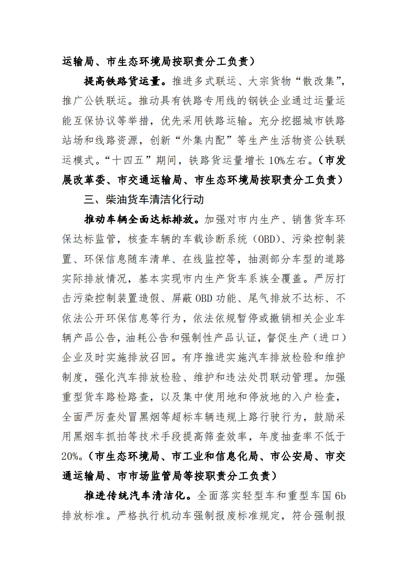 附件3朝阳市柴油货车污染治理攻坚新突破三年行动方案一、攻坚目标到2025年,运输结构、车船结构清洁低碳程度明显提高,燃油质量持续改善,机动车船、工程机械超标冒黑烟现象基本消除,柴油货车排放检测合格率超过90%,柴油货车氮氧化物排放量下降12%,新能源和国六排放标准货车保有量占比力争超过40%,铁路货运量占比力争达到15%左右。二、推进“公转铁”行动持续提升铁路货运能力。加大铁路货运班列开行范围,提升主要物流通道干线铁路运输能力。推进普速铁路扩能提质及电气化改造,加快国家高铁通道客货分线运输。加快推进锦赤线朝阳段货运铁路能力提升。(市发展改革委牵头,市交通运输局、市生态环境局参与,各县市区人民政府负责落实。以下各项任务均需各县市区人民政府负责落实,不再一一列出)加快铁路专用线建设。精准补齐工矿企业、物流园区铁路专用线短板,实现“门到门”服务。新建及迁建煤炭、矿石、焦炭大宗货物年运量150万吨以上的物流园区、工矿企业,原则上要接入铁路专用线或管道。推动大型物流园区轨道交通、铁路专用线建设,逐步实现大宗货物年运量150万吨以上的物流节点通铁路专用线。(市发展改革委、市交通
