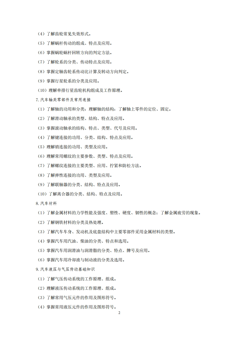 车辆维修类专业知识考试标准一、考试范围和要求知识模块1.汽车机械基础及维修基础知识1.制图基本知识(1)了解国家标准中对图纸幅面及格式、比例、字体、图线等制图基本规定。(2)了解尺寸标注的基本规则、尺寸的组成、常见尺寸的标注方法。2.视图基础知识(1)了解组合体的投影规律。(2)掌握组合体的三视图画法与识读方法。(3)了解向视图、局部视图和斜视图的画法和标注。(4)掌握各种剖视图的画法、标注及识读方法。(5)了解移出断面、重合断面的画法和标注。3.标准件、常用件基础知识(1)了解螺纹的规定画法及标注。(2)了解单个及啮合的标准直齿圆柱齿轮画法及简化画法。(3)了解普通平键和销连接的规定画法。(4)了解常用滚动轴承的规定画法和简化画法。4.零件图基础知识(1)了解典型零件的表达方法和零件图的尺寸标注方法。(2)了解识读零件图的方法与步骤。5.汽车常用机构基础知识(1)了解铰链四杆机构的基本类型、特点及应用。(2)了解铰链四杆机构类型的判定。(3)掌握曲柄滑块机构的特点及应用。(4)理解凸轮机构的组成、类型及应用。6.汽车机械传动(1)掌握带传动的工作原理、特点、类型及应用。(2)了解链传动的组成、特点、类型及应用。(3)了解齿轮传动的特点、类型及应用。