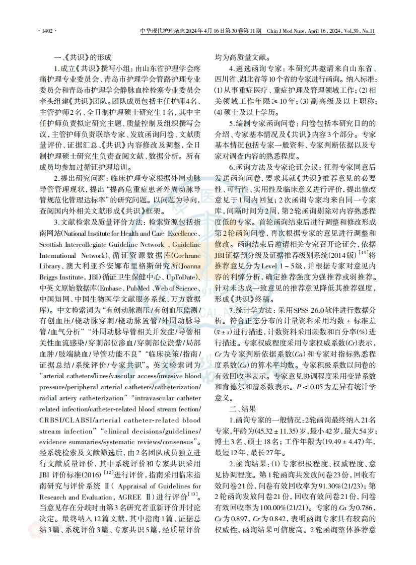 中华现代护理杂志2024年4月16日第30卷第11期Chin J Mod Nurs,April16,2024,Vol.30,No.11·1401··指南与共识·成人ICU患者外周动脉导管管理专家共识青岛市护理学会管路护理专业委员会青岛市护理学会静脉血栓栓塞专业委员会山东省护理学会疼病护理专业委员会通信作者:姜艳,Email:songqingna19910402@163.com【摘要】目的编制成人CU患者外周动脉导管管理专家共识》(以下简称《共识》)。方法以问题为导向,在查阅国内外相关文献基础上,通过德尔菲专家函询、专家论证会议形成《共识》。结果《共识》包括置管前评估、导管留置、带管期间观察及维护、并发症的预防措施和导管拔除5个部分,共形成33条推荐意见。结论《共识》具有一定的科学性,且内容临床适用性较强,能够为成人ICU患者外周动脉导管管理的临床实践提供指导和参考。【关键词】重症监护病房;成年人;外周动脉导管:专家共识D0I:10.3760/ema.j.cm115682-20230529-02126●Expert consensus on peripheral arterial catheter management in adult ICU patientsCatheter Nursing Professional Committee of Qingdao Nursing Association,Venous Thromboembolism ProfessionalCommittee of Qingdao Nursing Association,Pain Management Professional Committee of Shandong NursingAssociationCorresponding author:Jiang Yan,Email:songqingna19910402@163.com[Abstract Objective To develop the Expert consensus on peripheral arterial catheter management inadult ICU patients (hereinafter referred to as the Consensus).Methods Based on problem-oriented approachand consulting literature both domestically and internationally,the Consensus was formed through Delphiexpert consultation and expert argumentation meetings.Results The Consensus included five parts of pre-catheterization evaluation,catheter indwelling,observation and maintenance during catheterization,preventivemeasures for complications,and removal of peripheral arterial catheters,forming a total of 33 recommendeditems.Conclusions The Consensus is scientific and strongly applicable,which can provide guidance andreference for the clinical practice of peripheral arterial catheter management in adult ICU patients.[Key words Intensive Care Units;Adult;Peripheral arterial catheter;Expert consensusD0I:10.3760cmaj.cm115682-20230529-02126外周动脉导管是一种经皮穿刺动脉并留置于,及外周动脉导管的管理91],但尚不够具体,缺乏针人体管腔内与外界相通的管道,可用于监测血压、对性。此外,相关研究显示,CU护士导管管理相关判断血容量及采集动脉血标本,已成为危重症患者循证知识总知晓率为62.38%,其中仅3.38%的1CU血流动力学监测的主要工具,可减少反复穿刺给患护士能够依据循证知识进行护理操作。外周动者带来的痛苦和血管损伤。危重症患者血管条脉导管在ICU患者中的使用率高,但缺乏针对性、权件差、导管穿刺难度大、留置时间长,管理不当容威性的管理规范。故本研究团队邀请国内相关领域易出现多种不良事件,如导管相关性血流感染[23]的医疗和护理专家组成专家组,撰写《成人ICU患者细菌定植[4们、意外脱管51、穿刺处渗血渗液[]、导外周动脉导管管理专家共识》(以下简称《共识》),管阻塞[刃局部肿胀疼痛甚至肢端缺血坏死等],以期规范成人ICU患者外周动脉导管的管理流程,影响患者的临床治疗结局。目前国内外指南有提为临床实践提供指导。收稿日期202305-29本文编辑孙梦圆引用本文:青岛市护理学会管路护理专业委员会,青岛市护理学会静脉血栓栓塞专业委员会,山东省护理学会疼痛护理专业委员会.成人ICU患者外周动脉导管管理专家共识[J].中华现代护理杂志,2024,30(11):1401-1406.D0I:10.3760cma.j.cn115682-20230529-02126.