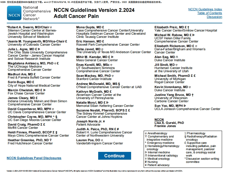 00提权医林通提供0指南全文下数,■l加t2于2024/03/18.10:49在医通平台下装,仅信个人使用,一慧分发,2022美国回家综合宽应同绪板权所有:National ComprehensiveNCCNCancer NetworkNCCN Clinical Practice Guidelines in Oncology (NCCN Guidelines)Adut Cancer PainVersion 2.2024-March 11,2024NCCN.orgContinue