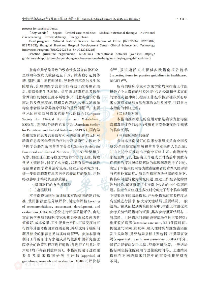 ·510·中华医学杂志2025年2月18日第105卷第7期Natl Med J China.February18,2025.Val.105.No.7·标准与规范·成人脓毒症患者医学营养治疗指南(2025版)中华医学会肠外肠内营养学分会通信作者:陈尔真,上海交通大学医学院附属瑞金医院重症医学科上海市重症医学质控中心,上海200025,Email:rjchenerzhen(@163.com【摘要】医学营养治疗影响脓毒症患者的预后,但是临床实施过程存在争议。为进一步规范脓毒症患者医学营养治疗,中华医学会肠外肠内营养学分会(CSPN)组织国内50余位重症医学、临床营养学、循证医学和统计学专家,按照推荐意见分级评价、制定与评估(GRADE)系统的标准和流程,通过系统性检索与证据梳理,并结合临床专家的实践经验制订本指南。指南针对脓毒症患者医学营养治疗中的营养风险筛查、早期医学营养治疗(肠内营养、肠外营养、能量供给、最佳目标蛋白质供给)、肠内营养治疗的输注方式、中医与肠道功能、营养补充剂(维生素、谷氨酰胺、山-3脂肪酸、硒)、益生菌、质子泵抑制剂的使用等方面作出了相应的推荐意见,最终形成14个问题、14条推荐意见,以期完善脓毒症患者医学营养治疗流程。【关键词】脓毒症;重症医学;医学营养治疗;营养风险筛查;蛋白质供给;能量供给基金项目:国家自然科学基金(82272234、82270087、82372203):上海申康医院发展中心临床科学技术创新计划(SHDC22021316.SHDC22023218)实践指南注册:国际指南协作网(网址:htps:∥guidelines.ebmportal.com/cspenzhongguochengrennongduzhenghuanzhey ingyangzhiliaozhinan)AGuidelines for medical nutritional therapy in adult sepsis patients(2025 edition)Chinese Society of Parenteral and Enteral NutritionCorresponding author:Chen Erzhen,Department of Emergency,Ruijin Hospital,Shanghai Jiao TongUniversity School of Medicine;Shanghai Critical Care Medicine Quality Control Center,Shanghai200025,China,Email:rjchenerzhen@163.comAbstract Although medical nutritional therapy affects the prognosis of sepsis patients,there is controversy over its clinical implementation process.To further standardize the medicalnutrition therapy of sepsis patients,the Chinese Society of Parenteral and Enteral Nutrition(CSPEN)organized more than 50 experts from critical care medicine,clinical nutrition,evidence basedmedicine and statistics to formulate the guidelines.The guideline was based on grading ofrecommendations,development and evaluations (GRADE)standards and procedures,throughsystematic retrieval and evidence sorting,and combined with the practical experience of clinicalexperts.The guidelines provide recommendations on nutritional risk screening in medical nutritiontherapy for sepsis patients,early medical nutrition therapy (enteral nutrition,parenteral nutrition,energy intake,optimal target for protein delivery),enteral nutrition infusion mode,traditionalChinese medicine and protecting intestinal function,nutritional supplements (vitamin,glutamine,omega-3 fatty acids,selenium),probiotics,and the use of proton pump inhibitors.Ultimately,14questions and 14 recommendations were formed in order to improve the medical nutrition therapyD0L:10.3760/cmaj.cm112137-20240813-01859收稿日期2024-08-13本文编辑朱冬冬引用本文:中华医学会肠外肠内营养学分会.成人脓毒症患者医学营养治疗指南(2025版)中华医学於志,2025.105(7:510-528.D0L:10.3760/cma.j.cn112137-20240813-01859.