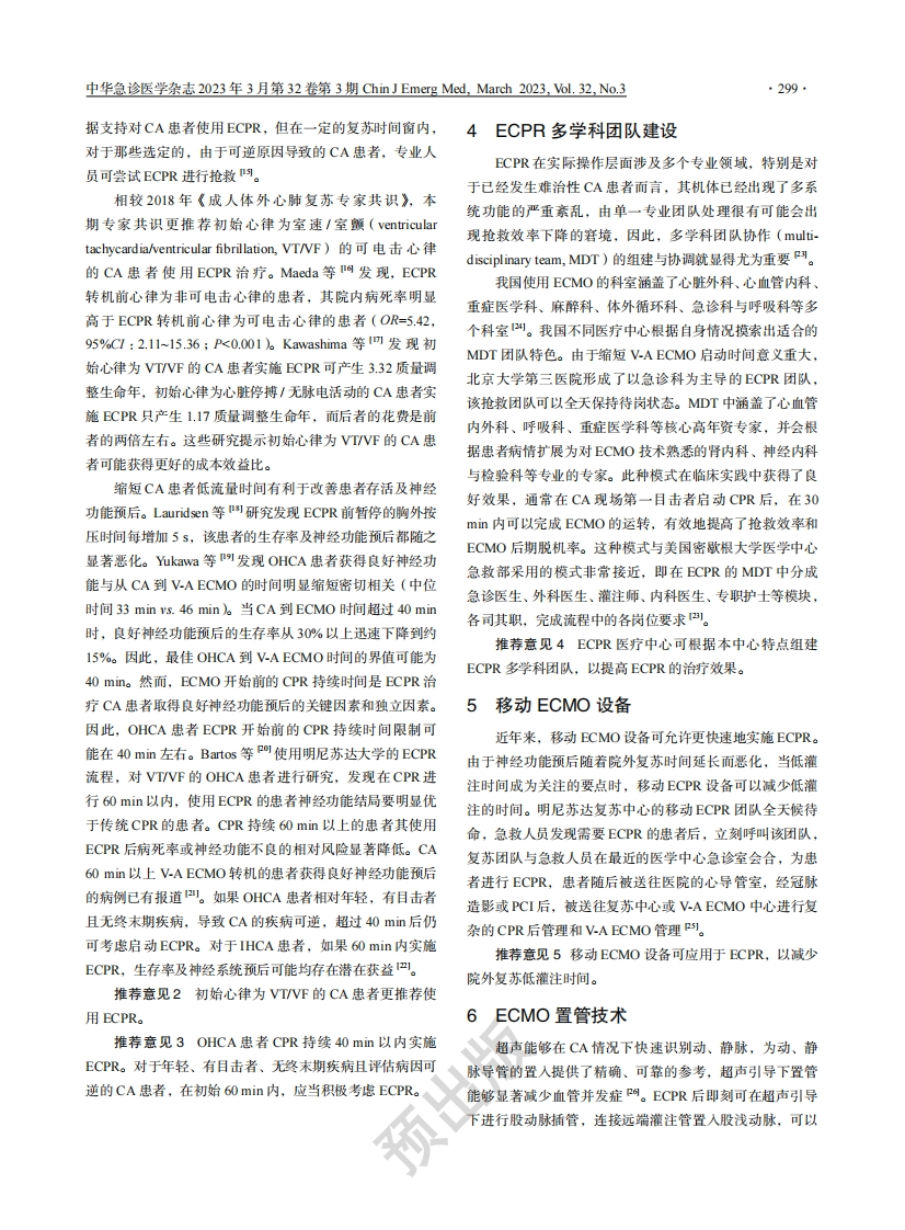 ·298·中华急诊医学杂志2023年3月第32卷第3期Chin J Emerg Med,.March2023,ol.32,No.3·专家共识·成人体外心肺复苏专家共识更新(2023版)中华医学会急诊医学分会复苏学组中国医药教育协会急诊专业委员会通信作者:马青变,Email:maqingbian@medmail.com.cm;张国强,Email:zhangchong2003@vip.sina.com;陈旭锋,Email:cxfyx@163.comD0:10.3760cma.i.issn.1671-0282.2023.03.005静脉·动脉体外膜肺氧合(venous-.arterialCPR)相比,ECPR能够提高冠状动脉的灌注压、ROSC率阿extracorporeal membrane oxygenation,V-A ECMO)在难治性以及除颤成功率阿,并且能够改善血流动力学状态,如颈心脏骤停(cardiac arrest,CA)中已得到广泛应用。我国急动脉血流量,减少心肌梗死面积)。ECPR能够提供充足的诊医学专家团队在2018年发表的《成人体外心肺复苏专家器官灌注,碱少缺血缺氧性脑病的风险。共识》I四中,系统阐述实施成人体外心肺复苏(extracorporealCA的治疗非常复杂,往往涉及多个学科的技术交叉。cardiopulmonary resuscitation,ECPR)过程中的关键问题,V-A ECMO、目标温度管理(target temperature management,.大大推进了国内急诊ECPR技术的开展。我国ECPR的发TTM),、经皮冠状动脉介人治疗(percutaneous coronary展远未满足临床需求,仍处于高速发展期,存在地域不均衡、intervention,PCI)等复杂技术均可应用于CA患者。V-A部分医院缺乏经验、在基础条件不具备的情况下急于开展ECMO的热交换器也能够应用于TTM,减少再灌注损伤,等情况,加之ECPR发展迅速,基于上述情况,本文结合并减轻继发性脑损伤。国内及国外学者均有报道ECPR联新近文献及临床实践对2018年共识进行补充及更新。合TTM可改善难治性CA患者预后,患者取得良好的神经功能预后。Pag等o研究了TTM在接受ECPR治1ECPR的应用现况疗的难治性OHCA患者中的重要性,这项回顾性研究显欧洲、北美、日本和韩国对ECPR的研究较为领先。示,接受ECPR和TTM的患者的出院存活率和神经功能预欧洲的注册研究显示2011年5月到2018年1月间发生后均有显著改善。与常温下的ECPR相比,低温组的神经的可疑心源性院外心脏骤停(out-of-hospital cardiac arrest,功能预后较好,患者的出院存活率更高(42.9%3.15.4%OHCA)中大约4%的患者使用了ECPR四。截止2022年P=0.020)。从CA到温度达标的时间越短,患者的神经功10月,体外生命支持组织注册的成人ECPR病例共12125能预后越好凹。由于ECP℉能够提供稳定的全身灌注,即例,其中42%的患者能成功撤除V-A ECMO,30%能够出使发生持续性室颤,使用ECPR的患者也能进行PC☑。院或者等候至器官移植。CHEER试验纳入了26例30min内未能ROSC的院内目前国内部分地区已经建成了区域性ECPR中心,且心脏骤停(in-hospital cardiac arrest,IHCA)及OHCA患者,获得了良好的治疗效果。南京医科大学第一附属医院急诊使用机械心肺复苏、TTM、V-A ECMO以及对可疑冠状动中心2015一2022年0HCA患者出院存活率22.5%,存活患脉闭塞的患者进行冠脉介入等技术,其中14例患者出院时者中T7.8%神经功能预后良好。然而,部分医疗结构技神经功能完全恢复。这项研究提示CA后包括V-A ECMO术不全面、受制于伦理及费用昂贵等,ECPR技术的发展的集束化治疗可能有效改善患者预后。仍处于瓶颈期。建立完备的分级转诊机制、做好定期专业推荐意见1根据CA患者情祝,ECPR可联合TTM、培训、资质认证和后续质量控制将成为我国ECPR技术健冠状动脉介入治疗等实施集束化治疗,以期改善患者预后。康持续发展的关键。3ECPR的适应证与应用时机2ECPR联合其他急救技术的集束化治疗目前尚无统一的ECPR适应证。2019年美国心脏病协可能有助于改善患者预后会(AHA)指南更新中指出目前没有足够证据推荐CA患ECPR开始后,即使尚未恢复自主循环(return of者常规使用ECPR,但传统CPR失败且有熟练医生快速实spontaneous circulation,ROSC),体外循环仍可为全身脏器施ECPR时可对选择的患者实施ECPR4。随后在2020年,提供灌注。与传统心肺复苏(cardiopulmonary resuscitation,.AHA指南对ECPR的适应证进行了更新:目前没有足够证