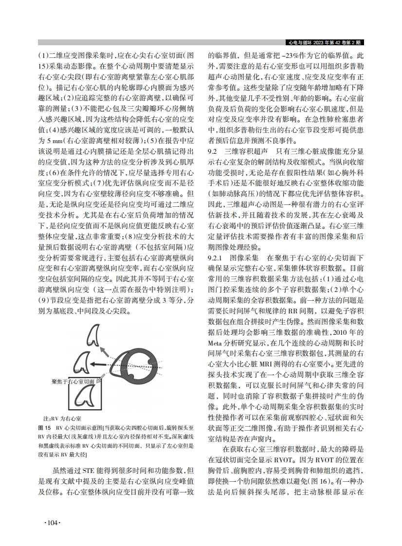 心电与裕环2023年第42卷第2期●专家共识成人右心超声心动图评估浙江实践指南与共识(二)浙江省超声医学工程学会超声心动图专业委员会浙江省医学会超声医学分会[摘要]右心的结构和功能受到广泛的生理和病理条件的影响。对右心参数进行量化分析在临床诊断、预后判断和监测治疗效果等一系列临床应用中非常重要。尽管超声心动图仍然是右心评估的首选成像方式,但与左心室比较,现有指南相对较少。本文根据《美国超声心动图协会(ASE)成人右心超声心动图诊断指南》《英国超声心动图协会(BSE)实践指南:成人右心超声心动图评估》和《2022欧洲心脏病学会(ESC/欧洲呼吸协会(ERS肺动脉高压的诊断和管理指南》,由浙江省超声医学工程学会超声心动图专业委员会、浙江省医学会超声医学分会组织浙江省青年超声心动图专业工作者进行翻译和整理,主要阐述超声心动图评估右心的原则和实际操作规范,包括腔室大小和功能的量化及瓣膜功能的评估,旨在进一步推广和提高浙江省超声心动图精准定量诊疗技术。[关键词]右心室;超声心动图;右心房;指南样物质单纯沉积于心内膜下纵向纤维时TAPE轻8几种相关疾病的右心室评价方法闪度减低,而随着累及的心肌组织范围扩大造成左心在影响右心的众多先天性和后天获得性疾病室相关和毛细血管后肺动脉高压时TAPSE进一步中,右心室结构和功能变化存在很大不同。常规超减低。由此可见,TAPSE是一个较好反映心脏淀粉声心动图右心室指标在众多疾病中呈现出不同的样变性患者病理生理学演变的指标。致心律失常性灵敏度和特异度,所以应用超声心动图评估右心室右心室心肌病(arrhythmogenic right ventricular car-结构和功能过程中,应根据不同的疾病情况做具体diomyopathy,ARVC)是从局限于右心室细微变化到分析,而不是采用统一参数和截断值。以下通过几心腔明显扩张和(或)功能障碍一系列结构和功能种影响右心室病理生理变化的典型疾病(如:压力表现异常的心肌疾病。超声心动图诊断ARVC的标负荷增加、浸润性疾病及心肌疾病等)对右心室的准包括从右心室壁节段性运动减弱为主要表现的评估进行说明:TAPSE代表右心室的纵向收缩功室壁运动异常和局限性室壁瘤,以及于胸骨旁长轴能,TAPSE减低是预测肺动脉高压患者预后的独立及短轴切面测量RVOT内径和FAC等参数。因此,因素,且获取操作简单,因此测量TAPSE被大家广在临床中评估此类患者右心室时不能仅仅获取单泛使用。然而,在右心室后负荷增加的状态下,径向一反映纵向功能的指标,而应全方面的评估其结构收缩功能能更好地反映右心室整体功能,故评估肺与功能的变化。动脉高压患者右心室时,应联合使用能够反映关于9评估右心功能的新技术啊径向功能的右心室面积变化分数进行综合评估。心脏淀粉样变性是一种心肌浸润紊乱的典型限制性9.1斑点追踪超声心动图(speckle tracking echo-心脏病,通过评价其右心室纵向功能可较好地反映cardiography,STE)STE已被广泛应用于提供右心其右心功能情况。与心脏MRI检查比较,TAPSE获室心肌变形的信息。例如,STE中的右心室纵向应变取的右心室射血分数可更好反映心脏淀粉样变性在各种情形下已被证明是可行的、重复好的新方患者右心功能,并可灵敏反映心肌浸润程度。淀粉法。然而,STE的临床应用受到机器厂家硬件和软件算法等的限制。因此,欧洲协会心血管影像协会(European Association of Cardiovascular Imaging,D0I:10.121245.issn.2095-3933.2023.2.2022-5341EACVI)、ASE及生产厂家正在努力促进右心室的二通信作者:郑哲岚.E-il:zze2002@163.cm维斑点追踪技术成像标准化,主要包括以下建议:*103·