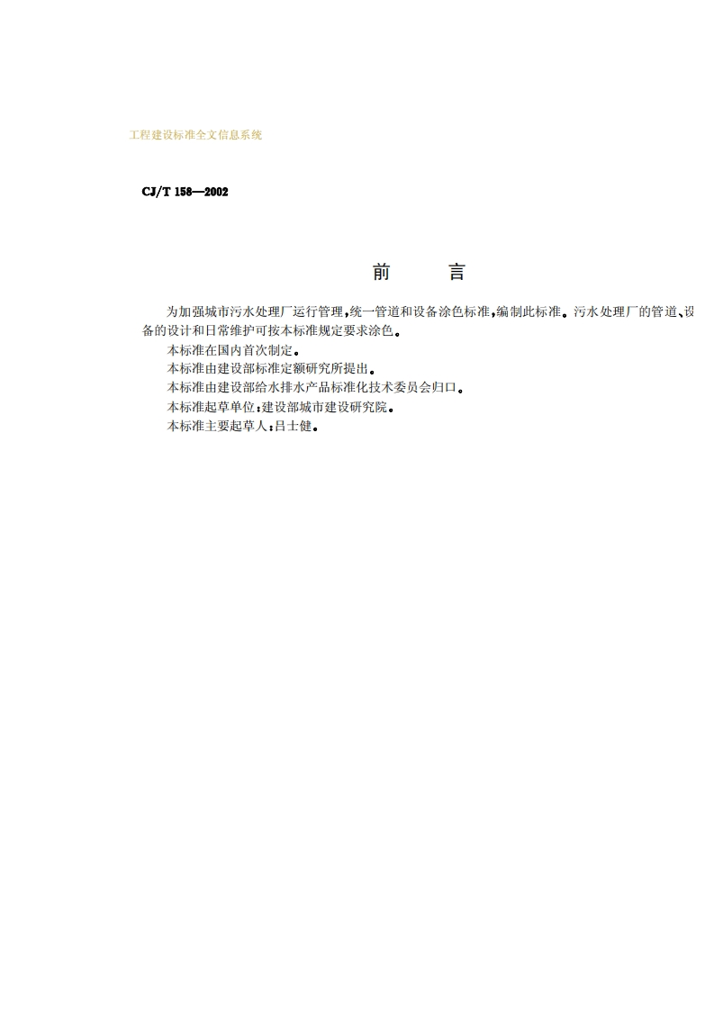 城市污水处理厂管道和设备色标348072@abc4个月前发布关注私信0.24MB5页021城市污水处理厂管道和设备色标此内容为付费资源,请付费后查看¥14¥24黄金会员免费钻石会员免费立即购买您当前未登录!建议登陆后购买,可保存购买订单付费资源 第1页 / 共5页 第2页 / 共5页 试读已结束,还剩3页,您可下载完整版后进行离线阅读 THE END标准规范 文本预览 工程建设标准全文信息系统CJ中华人民共和国城镇建设行业标准CJ/T158—2002城市污水处理厂管道和设备色标Colour standard for pipelines and equipments ofmunicipal wastewater treatment plants建标2002-0604发布2002-10-01实施中华人民共和国建沿部发布 查看更多 收起部分 喜欢就支持一下吧收藏