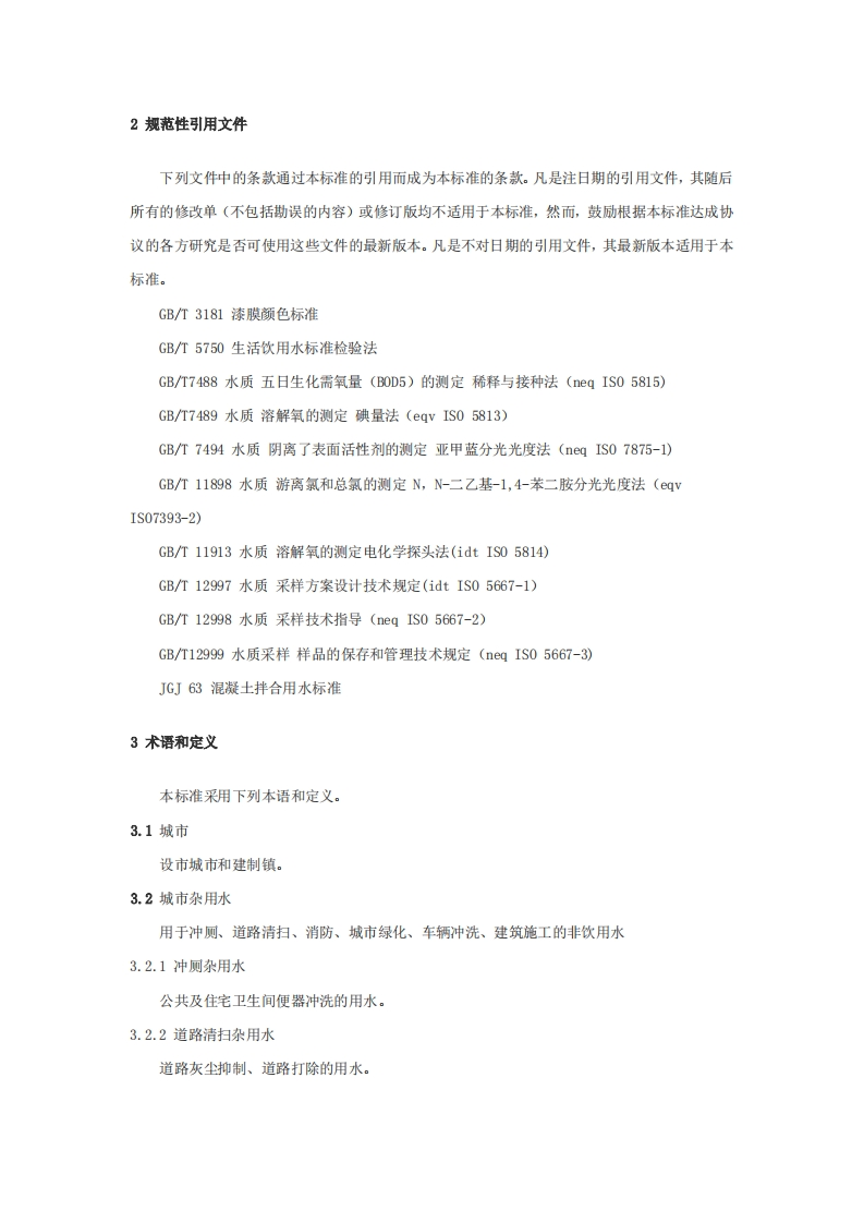 城市污水再生利用城市杂用水水质GB/T18920-2002前言为贯彻我国水污染防治和水资源开发方针,提高水利真是用率、做好城市节约用水工作,合理利用水资源,实现城市污水资源化,减轻污水对环境的污染,促进城市建设和经济建设可持续发展,制定《城市污水再生利用》系列标准。《城市污水再生利用》系列标准目前拟分为五项:一一《城市污水再生利用分类》一一《城市污水再生利用城巾杂用水水质》一一《城市污水再生利用景观环境用水水质》一一《城市污水再牛利用补充水源水质》一一《城市污水冉生利用工业用水水质》本标准为第二项。本标准是在CJ/T48-1999《生活杂用水水质标准》基础上制定的。本标准主要变化如下:(1)用水类别增加消防及建筑施工杂用水:(2)水质项目增加溶解氧,删除了氯化物、总硬度、化学需氧量、悬浮物:(3)水质类别由2个增加到5个:(4)水质指标值进行了相应调整。本标准自实施之日起,CJ/T48一一1999同时废止。本标准由中华人民共和国建设部提出。本标准由建设部给水排水产品标准化技术委员会归口。本标准由中国市政工程中南设计研究院负责起草本标准主要起草人:张怀宇、李树苑、杨文进、张小平、魏桂珍、张赐承1范围本标准规定了城市杂用城市杂用水规定了城市杂用水水质标准、采样及分析方法。本标准适用于厕所便器冲洗、道路清扫、消防、城市绿化、车辆冲洗、建筑施工杂用水。