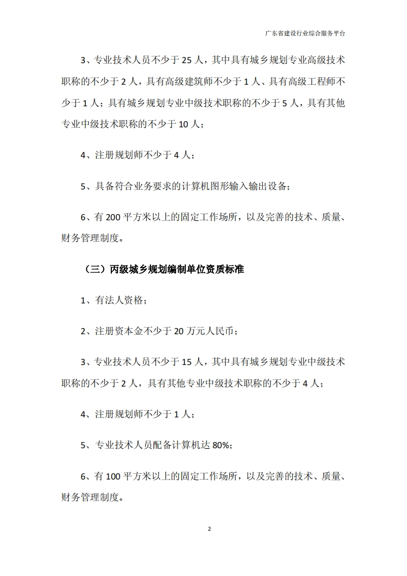 广东省建设行业综合服务平台城乡规划编制单位资质等级与标准城乡规划编制单位资质分为甲级、乙级、丙级。一、资质标准(一)甲级城乡规划编制单位资质标准1、有法人资格:2、注册资本金不少于100万元人民币:3、专业技术人员不少于40人,其中具有城乡规划专业高级技术职称的不少于4人,具有其他专业高级技术职称的不少于4人(建筑、道路交通、给排水专业各不少于1人):具有城乡规划专业中级技术职称的不少于8人,具有其他专业中级技术职称的不少于15人:4、注册规划师不少于10人:5、具备符合业务要求的计算机图形输入输出设备及软件:6、有400平方米以上的固定工作场所,以及完善的技术、质量、财务管理制度。(二)乙级城乡规划编制单位资质标准1、有法人资格:2、注册资本金不少于50万元人民币: