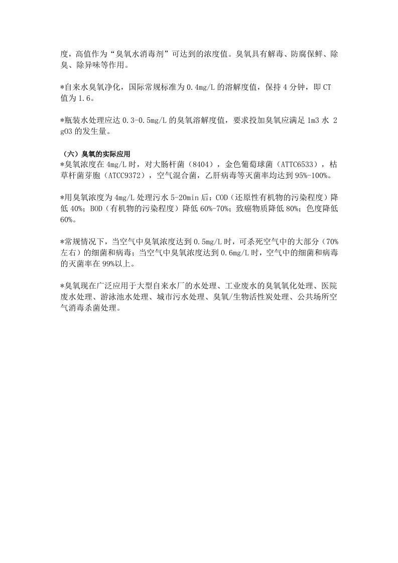 臭氧行业标准(一)安全浓度工业卫生标准:国际臭氧协会:0.1ppm美国:0.lppm德国、法国、日本:0.1ppm中国:0.15ppm(二)臭氧基本性质*臭氧的英文名字叫0Z0NE,分子式03,分子量48,是氧气(02)的同素异形体,由三个氧原子组成,常温下臭氧是淡蓝色,草腥味气体,1ppm臭氧=l.963mg/m3,标准状态下,臭氧密度p=2.144g/L,空气p=1.293g/L。臭氧在水中的溶解度大约是氧气的10-15倍。在水中稳定性较差。*臭氧易分解,不稳定状态下在空气中臭氧的半衰期为22.5分钟,一个小时的衰退率为61%,空气型臭氧在水温25℃时其溶解度只有3-7mg/L,纯臭氧在水中的溶解度可达1372mgL,在1%的臭氧水溶液中半衰期约为16分钟,且温度越高,湿度越大,半衰期越短。(三)臭氧具有广谱、高效强氧化性,有四大功用:灭菌、氧化、脱色、除味,且无残留物。*国际卫生组织对其灭菌功效曾归纳比较,臭氧与其它杀菌剂对大肠杆菌的杀灭效果依次为:臭氧(03)>次氯酸(HCL0)>二氧化氯(CL02)>银离子(Ag+)>次氯酸根(CL0)>高铁酸盐(Fe3+)>氯胺(NHCL3)。*臭氧具有很强的氧化性,除了金和铂外,臭氧化空气几乎对所有的金属都有腐蚀作用。铝、锌、铅与臭氧接触会被强烈氧化,但铬铁合金(不锈钢)基本上不受臭氧腐蚀。(四)空气应用浓度:*作为空气除味与杀菌,要求臭氧浓度较低,如0.5ppm(1mg/m3),而物品表面消毒(杀灭微生物和去除化学污染)则要求提高几十倍的臭氧浓度。*温度低,湿度大则灭菌效果好,尤其是湿度,相对湿度小于45%时,臭氧对空气中悬浮微生物几乎没有杀灭作用。在60%时才逐渐增强,在95%时达到最大值。*用臭氧消毒食品加工车间,0.5-1.0ppm即可杀灭空气中的80%的自然菌。冷库消毒要求臭氧浓度6-10ppm,停机后封库24小时以上细菌杀灭率90%左右。*在水果储藏期间,可用2-3ppm的臭氧可使霉菌的生长受到抑制,贮藏期可延长一倍。用臭氧水对食品灭菌很简单,浓度在0.5-1.0ppm,就可以达到灭菌的目的。(五)水中应用浓度:*水中臭氧溶解度在0.1mg/L-10mg/L之间。低值作为水消毒净化要求的最低浓