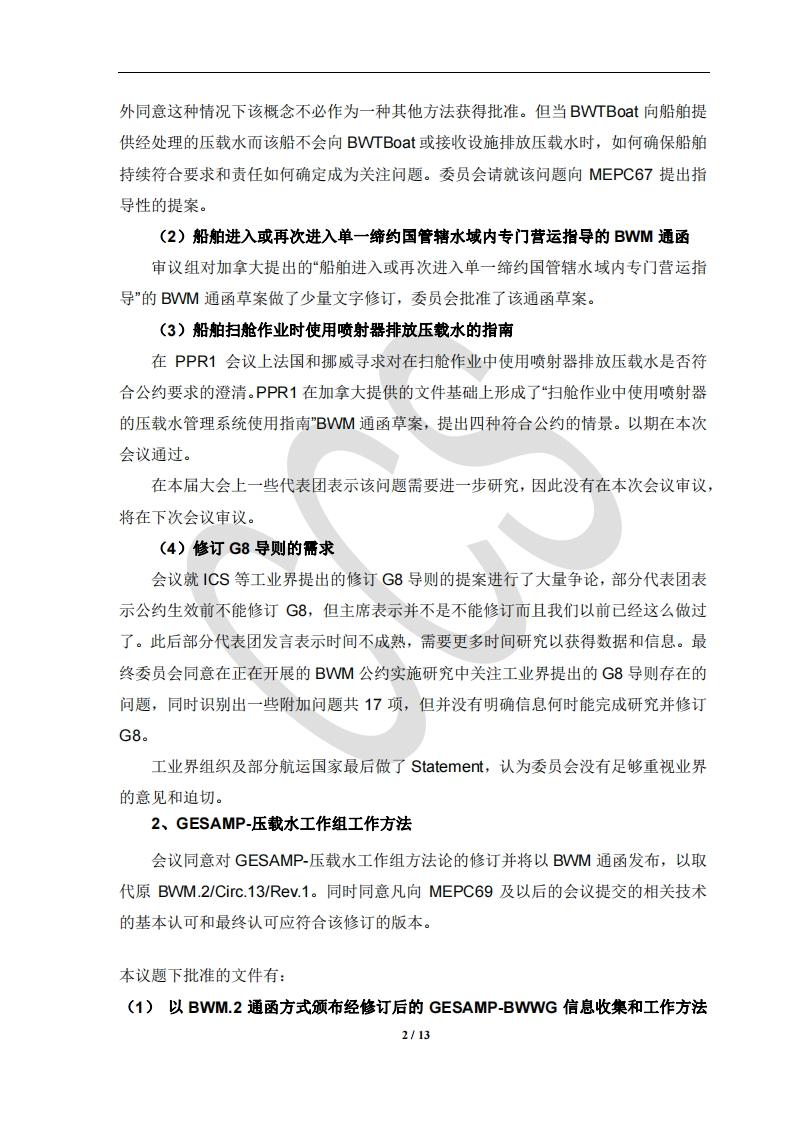 IMO海上环境保护委员会第66届会议(MEPC66)会议要点快报中国船级社2014年4月11日国际海事组织(IMO)海上环境保护委员会第66届会议(MEPC66)于2014年3月31日至4月4日在伦敦召开。本次会议共有21项议题,主要包括压载水有害水生物、拆船、空气污染及能效、GHG减排、强制性文件的审议和通过、MARPOL公约及其相关文件的修正和解释、商船噪声及对海洋生物影响等议题。会议设置了三个工作组(空气污染及能效工作组、便利船舶技术转让特别专家工组、提高能效进一步措施工作组)、一个审议组(压载水管理)和一个起草组(强制性文件修订起草组)。会议按照批准的议程和议题完成了各项工作,现将会议的主要情况报告如下:一、会议总体情况106个成员国,1个副成员(香港),3个联合国专门机构,5个政府间组织,45个非政府间组织参加了会议。我国派出由交通运输部、外交部、工信部、科技部和国家发改委组成的21人代表团,在我驻英使馆海事处领导下参加了大会及所有工作组和起草组的会议。巴拿马的Arsenio Dominguez先生为本次会议主席。二、压载水有害水生物(议题2)1.BWM公约生效情况截止2014年4月4日,共有38个国家,约占世界总吨位30.38%,加入了该公约。尚未达到生效条件。2.压载水处理技术批准委员会在本次会议上审议并授予4家MO基本批准和2家最终批准。截至MEPC66会议,预计共有49个压载水处理系统获得基本批准:33个压载水系统获得最终批准:至少42个压载水系统获得型式认可(包括非活性物质压载水系统)。3.BWM公约实施问题(1)港基移动式压载水处理设施(BWTBOAT)审议组一致性支持印度提出的BWTBoat概念,并认为是一种创新。对可实施性开展了大量讨论,认为:当BWTBoat接收来自船舶的压载水时应视为接收设施,另1/13