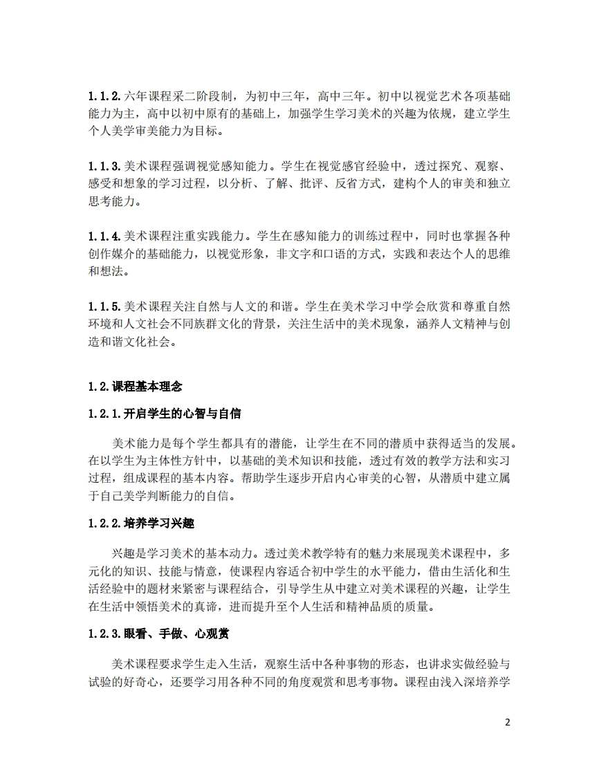 马来西亚华文独中《初中美术课程标准》(2013年8月制定)1.前言美术课程作为一门人文与艺术类的学科,在面对未来资讯社会快速发展的时代,必须掌握人文的内涵和探究知识的能力,透过美术学习除了教导学生基本绘画的技巧与美术知识,更应该教导学生在生活中探究、观察、感受和想象的能力,进而达到提升个人心灵与生活价值的素质。在视觉艺术活动中,使学生学习创作和表达其观念与情感,用分析、了解、批评、反省其作品所涵盖的感受与经验所象征的意义,进而了解艺术作品与社会文化的关系,现今的美术教育不再只是局限于教导绘画技巧的教学模式,应该以更自主、开放、弹性的全方位人文素养为内容的美术教育,并以学生为主体的教学,统整与结合其他学科领域的知识以达到具备理性、感性和知性的学生。“艺术生活化,生活艺术化”,生活是文化与艺术永续发展的根源,因此美术教育应该让学生学习探究生活环境的人、事、景和物,以养成对自然景物的认识、对人文的关怀、对社会的关注和对科学的贡献,並懂得运用自己的感官、知觉和情感表达个人的生活经验和感受,以丰富生活和心灵。传承与融合,发扬马来西亚的文化特色,透过美术教育传承中华文化艺术的精髓与精神,同时也须要了解马来西亚各民族的文化艺术特色,在了解各自文化特色的过程中,经由創作表达的方式,融合各族文化特色,再造马来西亚所拥有的独特文化特色。在成人成才的教育基础上,以栽培出健全的青少年为目标,需要强调人与环境的和谐发展,并以生活为中心,达成自然科学与人文科学的平衡,使学生具备有创造的能力、文明的素养和欣赏与审美的能力。1.1.课程性质1.1.1.美术课程以对视觉形象掌握、自然与人文知识理解、生活应用与创造为特点,栽培具感性、理性和知性能力的学生,是学校推行美术教育的主要方针,是六年华文独中中学教育阶段学生必修的基础课程,在德、智、体、群、美、劳六育并重的教育理念中具有不可替代的作用。1