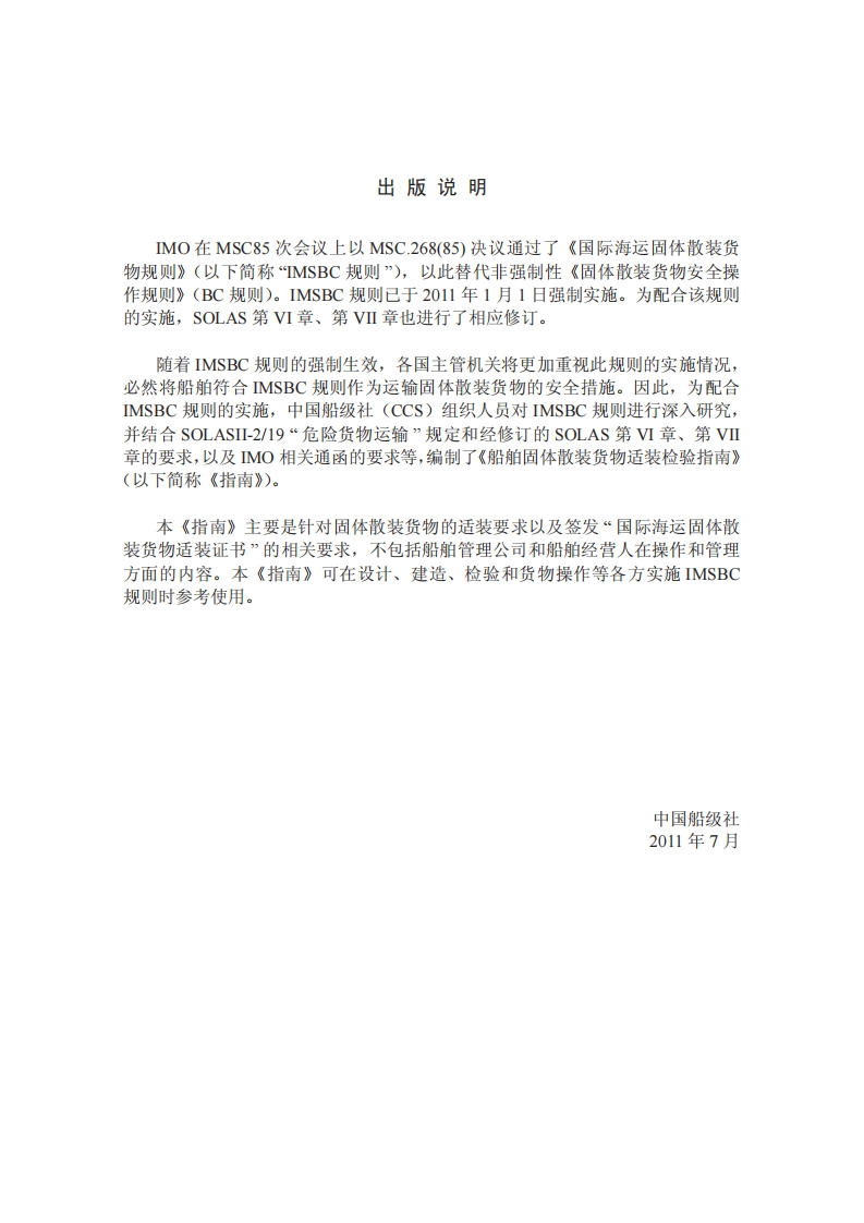 船舶固体散装货物适装检验指南2012348072@abc6个月前发布关注私信5.91MB52页023船舶固体散装货物适装检验指南2012此内容为付费资源,请付费后查看¥14¥24黄金会员免费钻石会员免费立即购买您当前未登录!建议登陆后购买,可保存购买订单付费资源 第1页 / 共52页 第2页 / 共52页 试读已结束,还剩50页,您可下载完整版后进行离线阅读 THE END标准规范 文本预览 、级指导性文件GUIDANCE NOTESGD01-2012CHINASOCIETYCLASSIFICATIONS中国船级社船舶固体散装货物适装检验指南GUIDELINES FOR INSPECTION OF FITNESS FORCARRIAGE OF SOLID BULK CARGOES BY SHIPS2012北京Beijing 查看更多 收起部分 喜欢就支持一下吧收藏