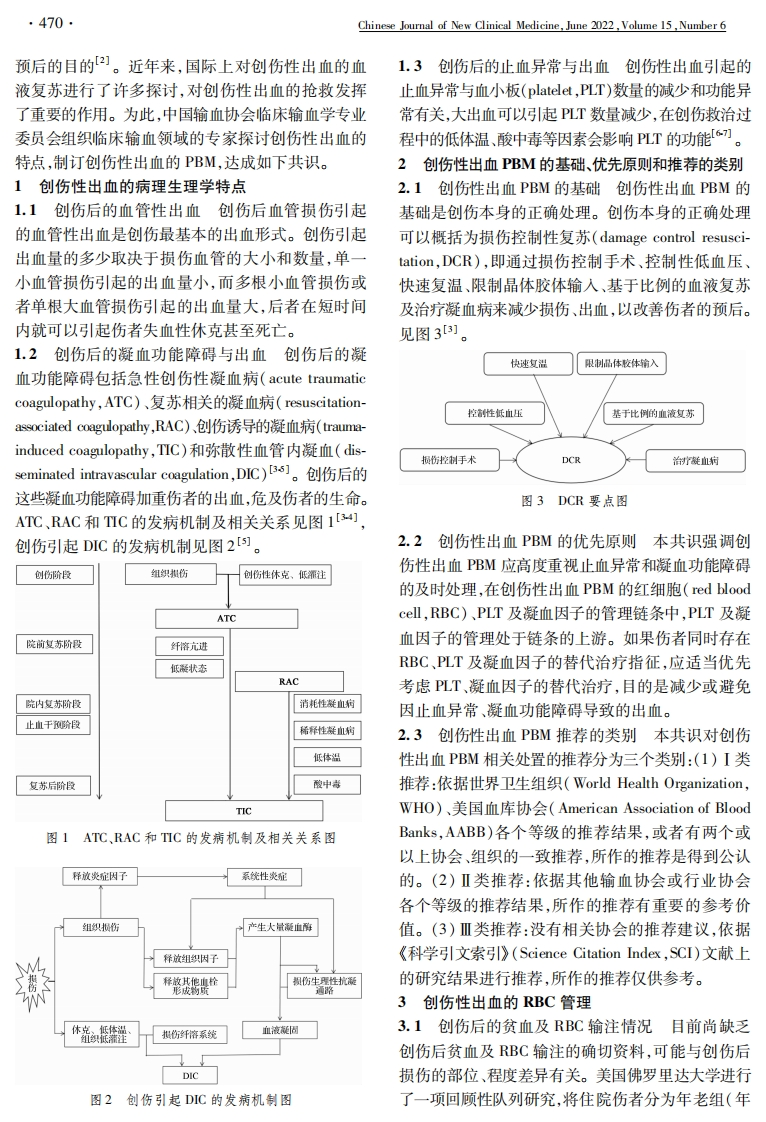 中国临床新医学2022年6月第15卷第6期·469·专家共识创伤性出血患者血液管理专家共识(2022年版)中国输血协会临床输血学专业委员会组长(通信作者)周吉成(广西医科大学第一附属医院揄血科、血液科,E-mail:2l964jc@126.com);胡丽华(华中科技大学同济医学院附属协和医院输血科,E-mail:Xhhulh@I26.com)执笔者周吉成(广西医科大学第一附属医院输血科、血液科)编写专家(按姓氏笔画排序)马现君(山东大学齐鲁医院输血科),尹文(空军军医大学西京医院输血科),文军(新疆雏吾尔自治区人民医院输血科),王学锋(复旦大学附属瑞金医院输血科),王宝燕(西安交通大学第一附属医院输血科),白连军(北京协和医院输血科),吕先萍(郑州大学第一附属医院输血科),李玲(中国医学科学院输血研究所),杜春红(天津医科大学总医院输血科),陆华(重庆医科大学附属第二医院输血科),陈风(内蒙古自治区人民医院输血科),陈风花(华中科技大学同济医学院附属协和医院输血科),陈志娇(宁夏医科大学总医院输血科),单桂秋(南部军区总医院输血医学科),周小玉(南京医科大学第一附属医院输血科),林甲进(温州医科大学附属第二医院输血科),宫济武(北京医院输血科),赵学涛(河北医科大学第四附属医院输血科),骆群(解放军总医院第五医学中心输血科),唐长玖(江西省人民医院输血科),夏荣(复旦大学附属华山医院输血科),来建风(东部战区总医院输血医学科),黄远帅(西南医科大学附属医院输血科),曾小菁(贵州医科大学附属医院输血科、血液科),焦晋山(山西医科大学附属第一医院输血科),董伟群(昆明医科大学附属第一医院揄血科),谢珏(浙江大学医学院附属第一医院输血科),潘健(中国科学技术大学附属第一医院输血科),穆士杰(空军军医大学唐都医院输血科)[摘要]严重创伤是致死、致残的主要原因,每年造成全球多达800万人死亡,而创伤性出血是伤者死亡的首要原因。目前,我国尚缺乏切实可行的创伤性出血的血液复苏规范,影响伤者的预后。中国输血协会临床输血学专业委员会推出的《创伤性出血患者血液管理专家共识(2022年版)》,强调创伤性出血患者的血液管理一定要基于正确的损伤控制性复苏基础上,重视血小板及凝血因子的管理,制订了切实可行的创伤性出血的大量输血程序。[关键词]创伤;出血;患者血液管理;红细胞;血浆;血小板[中图分类号]R457[文献标识码]A[文章编号]1674-3806(2022)06-0469-08doi:10.3969/j.issn.1674-3806.2022.06.01Expert consensus on patient blood management for traumatic hemorrhage(2022 edition)Working Party onClinical Transfusion,Chinese Society of Blood TransfusionAbstract]Severe trauma is the main cause of death and disability,causing up to 8 million deaths worldwideevery year,and traumatic hemorhage is the leading cause of death among the injured persons.At present,there isstill a lack of feasible standard of blood resuscitation for traumatic hemorrhage in China,which affects the prognosis ofthe injured persons.For this reason,the Working Party on Clinical Transfusion,Chinese Society of Blood Transfusionhas formulated expert consensus on patient blood management for traumatie hemorrhage(2022 edition),emphasizingthat patient blood management for traumatic hemorrhage must be based on correct damage control resuscitation,andthe management of platelets and coagulation factors must be paid attention to.This expert consensus establishes a prac-tical massive transfusion protocol for traumatic hemorrhage patients.[Key words]Trauma;Hemorrhage;Patient blood management;Red blood cell;Plasma;Platelet严重创伤每年造成世界范围内600万~800万手段。患者血液管理(patient blood management,PBM)人死亡,引起伤者死亡的主要原因是创伤性出血山,是利用基于证据的多学科手段,通过减少失血、促进因此,血液复苏成为抢救创伤尤其是严重创伤的重要造血、减少不必要的输血等方法,从而达到改善患者