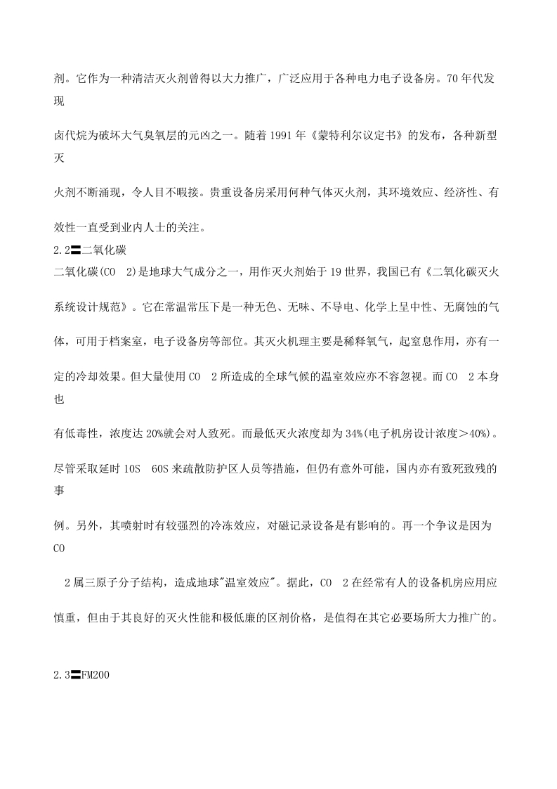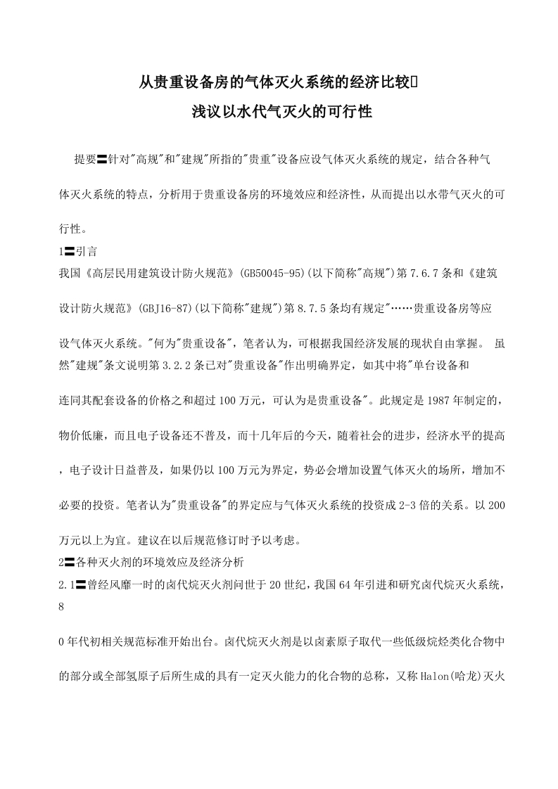 从贵重设备房的气体灭火系统的经济比较口浅议以水代气灭火的可行性提要〓针对”高规“和“建规“所指的“贵重”设备应设气体灭火系统的规定,结合各种气体灭火系统的特点,分析用于贵重设备房的环境效应和经济性,从而提出以水带气灭火的可行性。1二引言我国《高层民用建筑设计防火规范》(GB50045-95)(以下简称"高规“")第7.6.7条和《建筑设计防火规范》(GBJ16-87)(以下简称"建规“)第8.7.5条均有规定”…贵重设备房等应设气体灭火系统。“何为"贵重设备”,笔者认为,可根据我国经济发展的现状自由掌握。虽然“建规“条文说明第3.2.2条已对“贵重设备“作出明确界定,如其中将“单台设备和连同其配套设备的价格之和超过100万元,可认为是贵重设备”。此规定是1987年制定的,物价低廉,而且电子设备还不普及,而十几年后的今天,随着社会的进步,经济水平的提高,电子设计日益普及,如果仍以100万元为界定,势必会增加设置气体灭火的场所,增加不必要的投资。笔者认为"贵重设备"的界定应与气体灭火系统的投资成2-3倍的关系。以200万元以上为宜。建议在以后规范修订时予以考虑。2〓各种灭火剂的环境效应及经济分析2.1〓曾经风靡一时的卤代烷灭火剂问世于20世纪,我国64年引进和研究卤代烷灭火系统,80年代初相关规范标准开始出台。卤代烷灭火剂是以卤素原子取代一些低级烷烃类化合物中的部分或全部氢原子后所生成的具有一定灭火能力的化合物的总称,又称Halon(哈龙)灭火