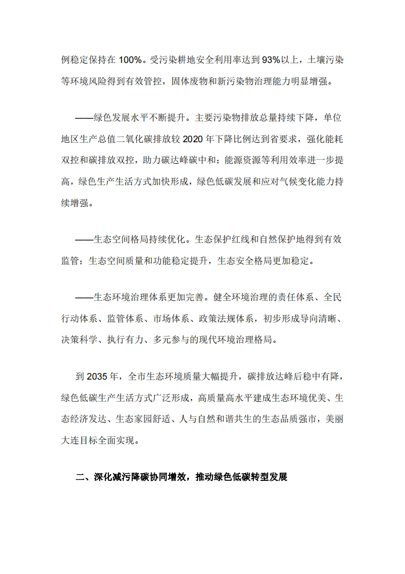 大连市深入打好污染防治攻坚战实施方案为深入贯彻落实《中共中央、国务院关于深入打好污染防治攻坚战的意见》(中发〔2021)40号)和《中共辽宁省委、辽宁省人民政府关于印发〈辽宁省深入打好污染防治攻坚战实施方案〉的通知》(辽委发〔2022)8号)精神,进一步加强生态环境保护,深入打好污染防治攻坚战,建设美丽大连,结合实际,制定本方案。一、总体目标到2025年,全市生态环境保护取得新突破,城市绿色低碳发展水平持续提升,能源资源利用效率进一步提高,碳排放强度和主要污染物排放总量持续下降:生态环境质量稳定改善,生态系统质量和稳定性整体提升,环境风险得到有效管控,生态环境治理体系更加完善,基本形成与大连“两先区”建设相匹配的城市生态环境格局,促进经济社会与资源环境协调可持续发展。一生态环境质量稳定改善。中心城区空气质量优良天数比率达到88.9%以上,城市细颗粒物(PM2.5)浓度不超过29.8微克/立方米,重污染天气基本消除:地表水国考断面达到或好于Ⅲ类水体比例达到100%,基本消除城市黑臭水体:近岸海域水质优良(一、二类)比例达到97.8%:县级及以上城市集中式饮用水水源水质达到或优于Ⅲ类比