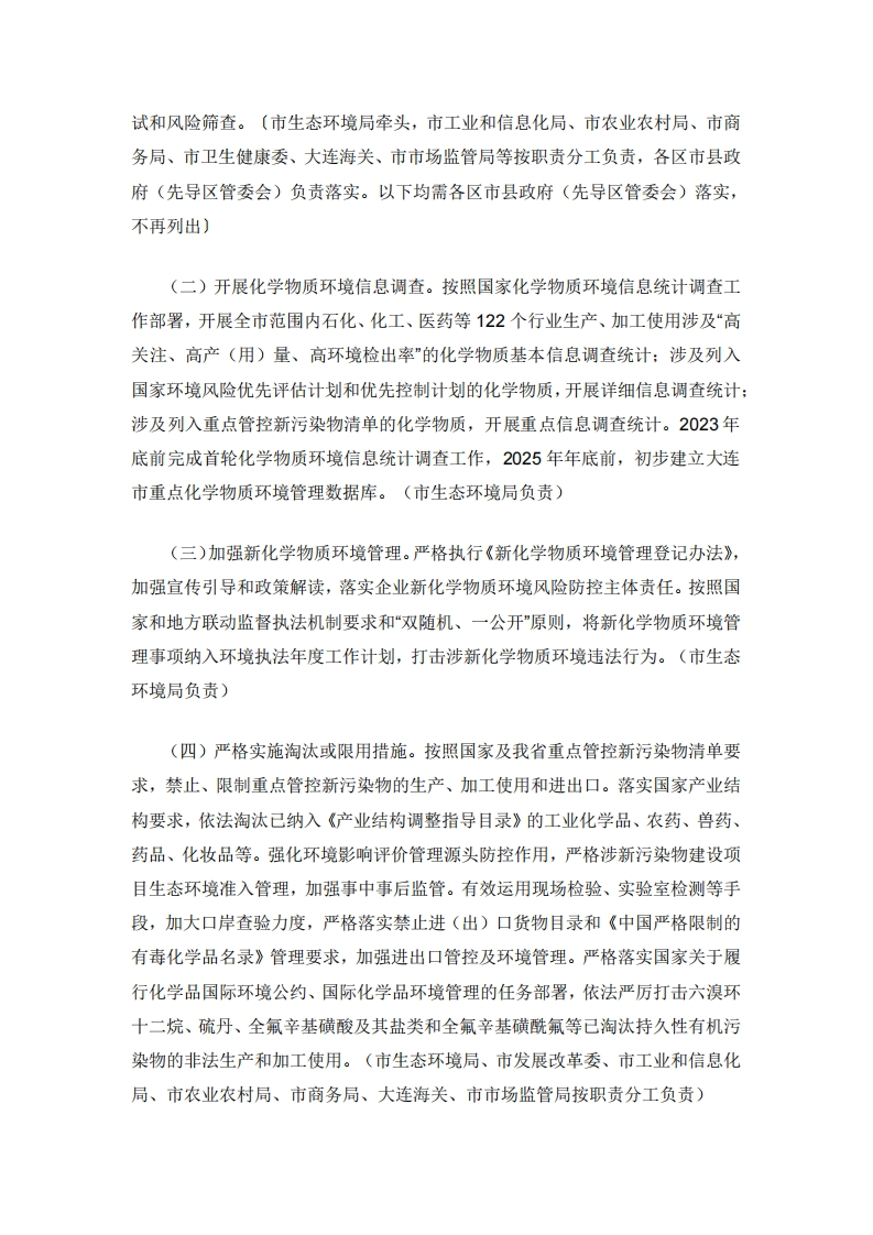 大连市新污染物治理工作方案为深入贯彻落实《国务院办公厅关于印发新污染物治理行动方案的通知》(国办发〔2022)15号)、《辽宁省人民政府办公厅关于印发辽宁省新污染物治理工作方案的通知》(辽政办〔2023)18号)要求,加强我市新污染物治理工作,切实保障生态环境安全和人民群众身体健康,制定本工作方案。一、总体要求以习近平新时代中国特色社会主义思想为指导,全面贯彻党的二十大精神,深入贯彻习近平生态文明思想,以精准治污、科学治污、依法治污为工作方针,遵循全生命周期环境风险管理理念,加强制度、科技、财政支撑保障,健全新污染物治理体系,协同推进新污染物调查监测、筛查评估、管控治理各项工作,提升美丽大连、健康大连建设水平,以生态环境高水平保护推动经济社会高质量发展,为我市“两先区“三个中心”建设提供坚实的生态环境保障。二、主要目标围绕典型工业园区、饮用水源地、农(水)产品产地、近岸海域等重点区域和石化、化工、印染、医药等重点行业,实施调查评估、分类治理,统筹推进新污染物环境风险管理。到2025年,基本摸清我市重点区域、重点行业化学物质环境信息,落实重点管控新污染物禁止、限制、限排措施,逐步建立健全有毒有害化学物质环境风险管理机制,新污染物治理能力明显增强。三、重点任务(一)强化重点新污染物管控。落实国家优先控制化学品名录的化学物质以及抗生素、微塑料等其他重点新污染物“一品一策”管控措施。依托我市现有生态环境监测网络,2025年年底前,初步构建我市新污染物环境调查监测体系,跟踪监测管控成效。结合我市实际情况,按照上级部署探索开展环境与健康危害测
