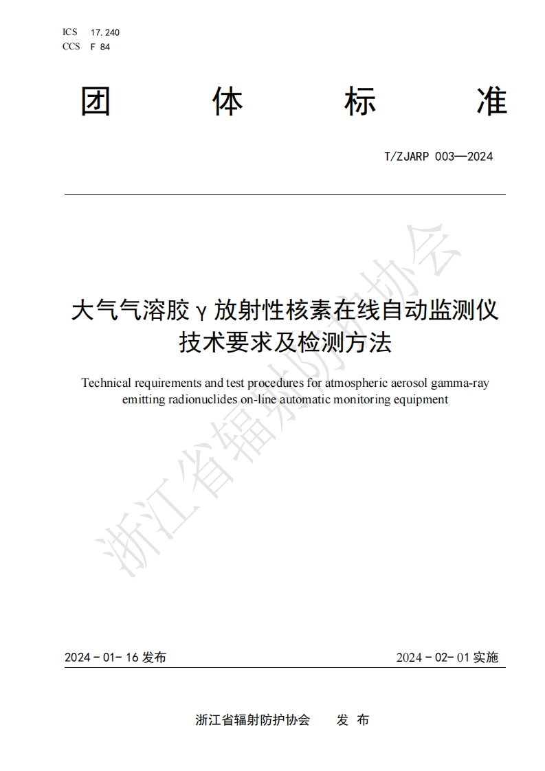 ICS17.240CCS F 84团体标准T/ZJARP003-2024大气气溶胶Y放射性核素在线自动监测仪技术要求及检测方法Technical requirements and test procedures for atmospheric aerosol gamma-ray浙江省辐emitting radionuclides on-line automatic monitoring equipment2024-01-16发布2024-02-01实施浙江省辐射防护协会发布