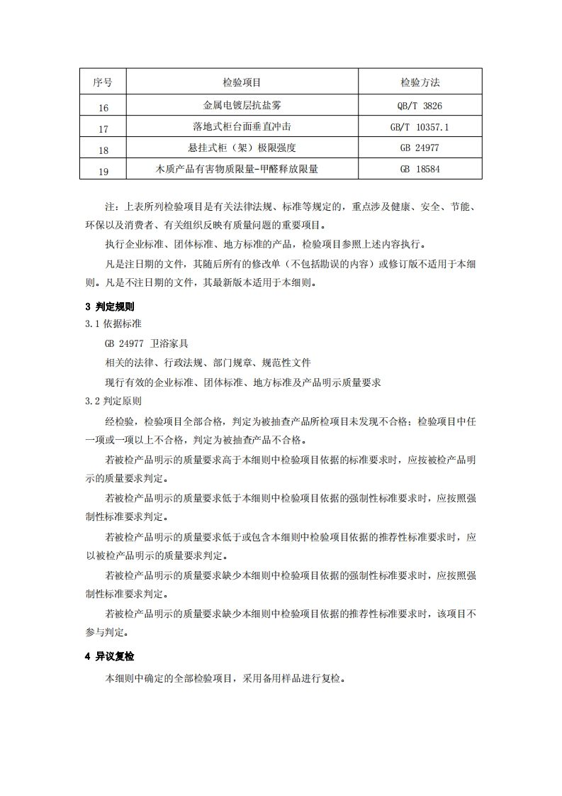 济南市卫浴家具产品质量监督抽查实施细则(2025年版)1抽样1.1抽样方法以随机抽样的方式在被抽样生产者、销售者的待销产品中抽取。1.2抽样基数抽查样品基数满足抽样数量即可。1.3抽样范围抽取同一规格型号、同一批次的产品。1.4抽样数量每个批次产品抽取样品2套,其中1套作为检验样品,1套作为备用样品。2检验项目及检测方法表2卫浴家具产品检验项目序号检验项目检验方法耐液性GB/T4893.12台盆柜台面理化性耐湿热GB/T4893.24能抗冲击强度GB249775耐液性GB/T4893.16耐湿热GB/T4893.22木质部件面漆膜理化性能耐干热GB/T4893.38耐冷热温差GB/T4893.79抗冲击GB/T4893.910耐液性GB/T4893.111软硬质覆面理化性耐湿热GB/T17657能12耐干热GB/T1765713耐冷热温差GB/T1765714金属表面涂层理化硬度GB/T673915性能冲击强度GB/T1732