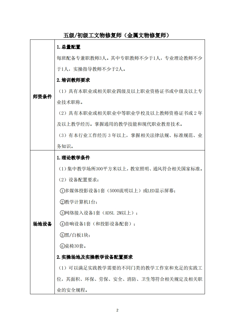 北京市朝阳区民办职业技能培训机构文物修复师(金属文物修复师)培训设置标准(试行)一、职业名称:文物修复师(金属文物修复师)从事金属文物现状调查、档案记录,并进行清洗、除锈、加固、拼接、整形、脱盐、连接、补配、作色、缓蚀、封护等修复工作的人员。二、职业编码:4-13-03-02三、技术等级:文物修复师(金属文物修复师)共设五个等级,分别为:五级/初级工、四级/中级工、三级/高级工、二级/技师、一级/高级技师。四、基础条件:1.举办五级/初级工文物修复师(金属文物修复师)培训应具有从事本职业或相关职业教育培训经历。2.举办四级/中级工文物修复师(金属文物修复师)培训应具有2年以上本职业五级教育培训经历。3.举办三级/高级工文物修复师(金属文物修复师)培训应具有2年以上本职业四级教育培训经历。4.举办二级/技师文物修复师(金属文物修复师)培训应具有2年以上本职业三级教育培训经历。5.举办一级/高级技师文物修复师(金属文物修复师)培训应具有2年以上本职业二级教育培训经历。五、设置要求:1
