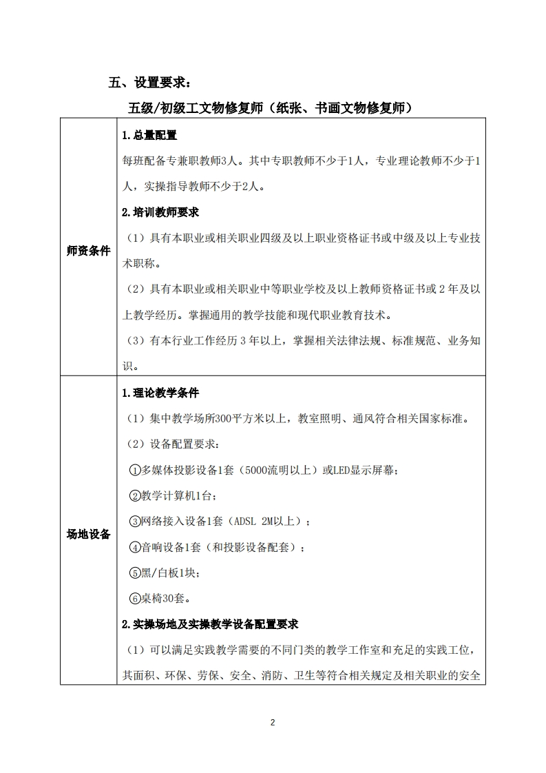 北京市朝阳区民办职业技能培训机构文物修复师(纸张、书画文物修复师)培训设置标准(试行)一、职业名称:文物修复师(纸张、书画文物修复师)从事纸张书画文物现状调查、档案记录,并进行清洗、拼对、揭心、补洞、托心、贴条、全色、接笔等修复工作的人员。二、职业编码:4-13-03-02三、技术等级:文物修复师(纸张、书画文物修复师)共设五个等级,分别为:五级/初级工、四级/中级工、三级/高级工、二级/技师、一级/高级技师。四、基础条件:1.举办五级/初级工文物修复师(纸张、书画文物修复师)培训应具有从事本职业或相关职业教育培训经历。2.举办四级/中级工文物修复师(纸张、书画文物修复师)培训应具有2年以上本职业五级教育培训经历。3.举办三级/高级工文物修复师(纸张、书画文物修复师)培训应具有2年以上本职业四级教育培训经历。4.举办二级/技师文物修复师(纸张、书画文物修复师)培训应具有2年以上本职业三级教育培训经历。5.举办一级/高级文物修复师(纸张、书画文物修复师)培训应具有2年以上本职业二级教育培训经历。y