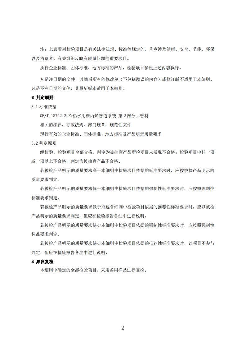 济南市无规共聚聚丙烯(PP-R)管材产品质量监督抽查实施细则(2025年版)1抽样1.1抽样方法以随机抽样的方式在被抽样生产者、销售者的待销产品中抽取。1.2抽样基数抽查样品基数满足抽样数量即可。1.3抽样范围抽查产品种类包括无规共聚聚丙烯(PPR)管材。1.4抽样数量每根管材原始长度为4米/根时,每批次产品抽取样品8根(4米根),每根管材截成4段(1米/段),每根中的2段作为检验样品,另2段作为备用样品。如每根管材的长度不足4m,可以增加抽取管材根数,保证截取段数满足上述要求。2检验项目及检测方法表1无规共豪聚丙烯(PP-R)管材产品检验项目序号检验项目检测方法规格尺寸GB/T18742.21(平均外径、壁厚)GB/T8806GB/T18742.22纵向回缩率GB/T6671GB/T18742.23简支梁冲击试验GB/T18743GB/T18742.24静液压试验(20℃,1h)GB/T6111GB/T18742.25静液压试验(95℃,165h)GB/T6111卫生要求6(铅、镉、高锰酸钾消耗量)GB/T17219GB/T18742.22灰分GB/T9345.1GB/T18742.28熔融温度GB/T19466.39氧化诱导时间GB/T18742.2GB/T19466.610透光率GB/T18742.2GB/T213001