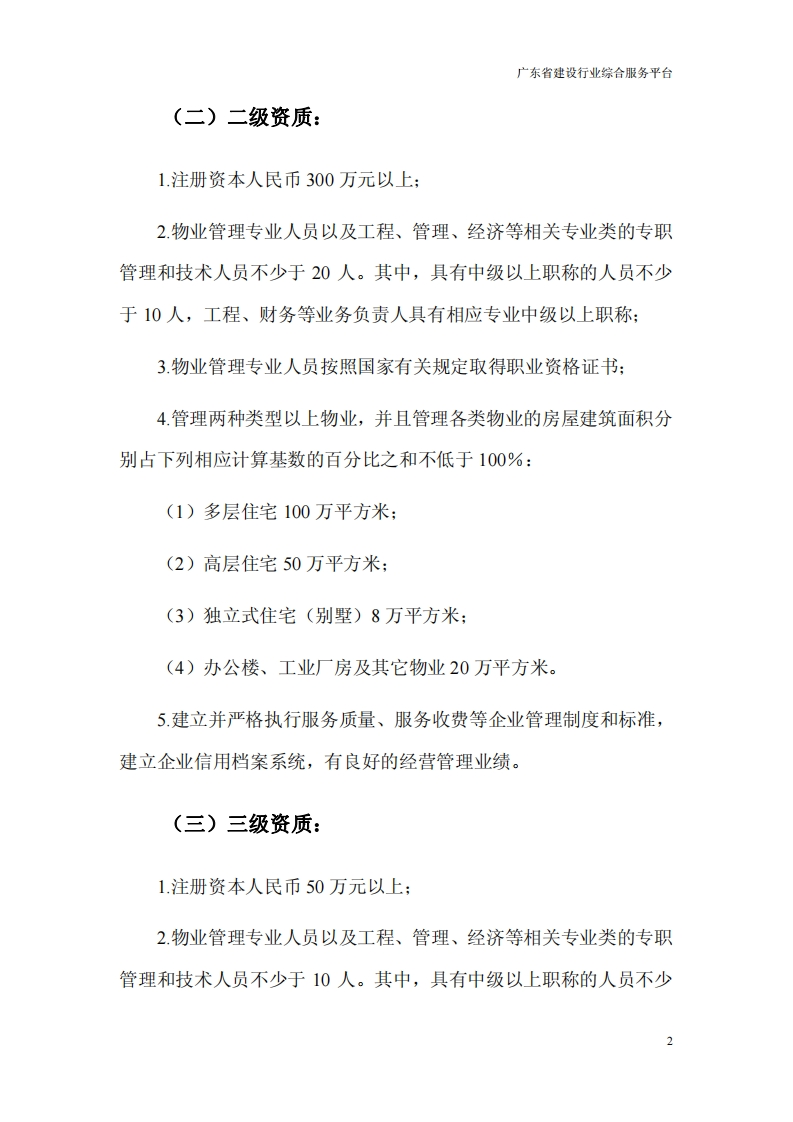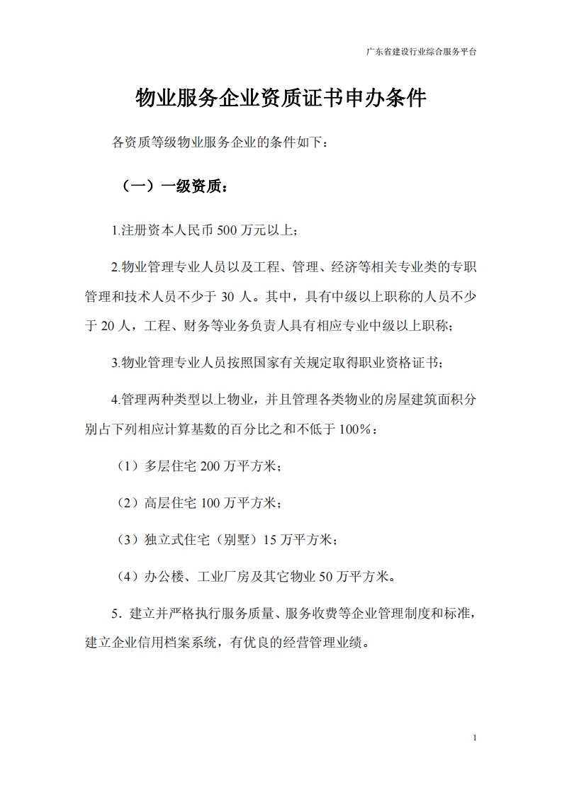 广东省建设行业综合服务平台物业服务企业资质证书申办条件各资质等级物业服务企业的条件如下:(一)一级资质:1.注册资本人民币500万元以上:2.物业管理专业人员以及工程、管理、经济等相关专业类的专职管理和技术人员不少于30人。其中,具有中级以上职称的人员不少于20人,工程、财务等业务负责人具有相应专业中级以上职称:3.物业管理专业人员按照国家有关规定取得职业资格证书:4管理两种类型以上物业,并且管理各类物业的房屋建筑面积分别占下列相应计算基数的百分比之和不低于100%:(1)多层住宅200万平方米:(2)高层住宅100万平方米:(3)独立式住宅(别墅)15万平方米:(4)办公楼、工业厂房及其它物业50万平方米。5.建立并严格执行服务质量、服务收费等企业管理制度和标准,建立企业信用档案系统,有优良的经营管理业绩。1