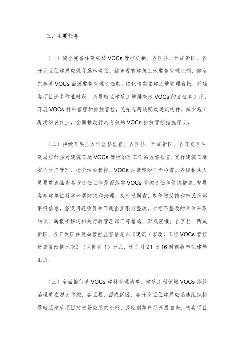 西安市住建领域挥发性有机物污染整治专项实施方案为进一步贯彻落实《西安市大气污染治理专项行动方案(2023一2027年)》(市字〔2023)32号)和相关工作要求,依据《西安市挥发性有机物污染整治专项实施方案》,深入开展挥发性有机物(以下简称“VOCs”)污染综合整治,降低住建领域VOCs排放,持续改善空气质量,结合我市建筑工程实际,制订本方案。一、总体要求以习近平生态文明思想为指导,深入贯彻落实绿色发展理念,坚持精准、科学、依法治污,按照近期与中长期目标兼顾、全面防控与重点防控相结合的工作思路,严格落实有关标准要求,全面加强我市房屋建筑工程和市政工程涉VOCs面源管控,提升建筑工程领域VOCs治理能力。二、工作目标房屋建筑(含装修)工程、市政工程的施工应全面使用符合国家和地方标准的非溶剂型涂料和胶粘剂,优先选用装配式建筑方式,减少施工现场涂装作业;除特殊功能要求外的室内地坪施工应使用无溶剂涂料和水性涂料。