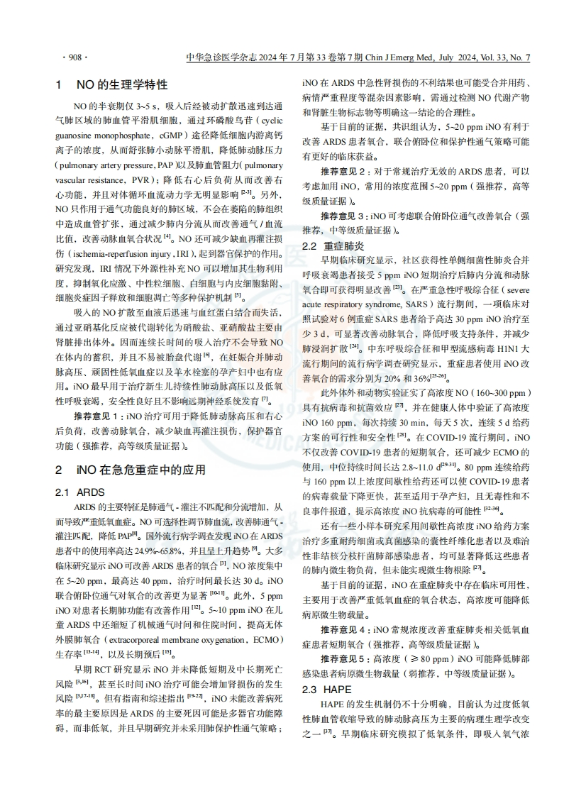 中华急诊医学杂志2024年7月第33卷第7期Chin J Emerg Med,Ju山y2024,oL.33.No.7·907··专家共识·吸入一氧化氮治疗在急危重症中的临床应用专家共识中华医学会急诊医学分会北京医学会急诊医学分会北京医师协会急救医学专科医师分会北京中医药大学脓毒症研究所通信作者:吴彩军,Email:wuca可jun@139.com;谢苗荣,Email:xiemiao.27@126.com;张国强,Email:zhangchong2003@vip.sima.com指南共识注册编号:PREPARE-2024CN152D0:10.3760cma.j.issn.1671-0282.2024.07.006一氧化氮(nitric oxide,NO)是一种无色、无刺激性气备投入临床使用,将面临适用患者人群、用法用量、以及安味的气体,具有脂溶性,广泛分布于人体各组织,可以快全性监测和撤机等问题。因此,本共识专家组制定了《吸入速透过细胞膜扩散,参与调控细胞的生理活动,是细胞间一氧化氮治疗在急危重症中的临床应用专家共识》,以期为重要的信号传导分子。外源性吸入时,NO是一种选择性肺临床合理应用NO治疗急危重症儿童和成人患者提供参考。血管扩张剂,为肺动脉高压、新生儿低氧性呼吸衰竭的有本共识通过国际实践指南注册与透明化平台(Practice效治疗手段,临床应用长达二十余年,其安全性和有效性Guideline Registration for Transparency,,PREPARE进行注册,已得到验证,并且应用范围逐渐拓展至急性呼吸窘迫综合注册号PREPARE-2024CN152。共识由专家组围绕NO在征(acute respiratory distress syndrome,.ARDS入重症肺炎、急危重症中的临床应用这一关键问题,检索数据库包括高原肺水肿(high altitude pulmonary edema,.HAPE)、人急性Pubmed、Neb of Science、Embase、Cochrance Library、万肺栓塞(acute pulmonary embolism,APE)、心力衰竭和手方数据知识服务平台、中国知网、维普数据库等;检索时术后严重低氧血症等急危重症并取得良好效果。限为建库至2024年3月31日。结合国内外相关研究进展、吸入一氧化氮(inhaled nitric oxide,.iNO)疗法在临床指南、专家共识等,通过四次会议讨论、修改,最终定稿。使用时通常使用百万分之一单位表示气体浓度(×10),本共识结合风险利弊、结论可推广性、适宜性以及资源常见设备采用ppm(parts per million)来表示计量单位,与利用等方面,借鉴GRADE(Grading of Recommendations国际标准单位质量-体积浓度(即mgm)之间的简化换算Assessment,.Development and Evaluations)指南意见,形成公式为:Y=30/22.4·X,式中Y为N0以mgm3表示的浓证据等级和推荐等级意见(表1。将推荐等级分为“强推荐、度值,X为NO以ppm表示的浓度值円。弱推荐”两个等级。当明确显示干预措施利大于弊或弊大建议选择医用NO气体用于临床治疗。目前临床使用于利时,视为强推荐;当利弊不确定或无论质量高低的证的NO设备根据气体来源可分为传统高压气瓶类和即时发据均显示利弊相当时,则视为弱推荐。生类:高压气瓶类NO设备传统上称之为“NO气体流量表1本共识推荐内容证据等级与推荐等级说明控制仪”,使用含氮气NO混合气的高压气瓶作为NO气体等级说明的来源,国内已有钢瓶存储的医用NO气体作为吸入制剂证据等级I(高等级)高质量的随机对照临床研究(RCT)人、权威指南获批,但适应证仅限于新生儿:即时发生类是将NO即时以及高质量系统综述和Ma分析生成、NO输送和监测模块整合的NO医疗设备,全球范Ⅱ(中等级)有一定研究局限性的RCT研究(如无隐藏分组围内共有四氧化二氮裂解法、电化学催化还原法和高压电未设盲、未报告失访)、队列研究、病例系列研究以及病例对照研究等弧放电法三种技术路线,其中后两种方法学国内已有相应Ⅲ(低等级)专家共识/声明、专家意见、病例报道、高质量设备获批用于临床。动物实验等推荐等级国际上O疗法相关的临床研究和实践经验丰富,多次强推荐明确显示干预措施利大于弊或弊大于利制定和更新NO在小儿和成人中的应用指南和专家共识。但弱推荐利弊不确定或无论质量高低的证据均显示利弊我国NO的应用起步较晚,随着国内医疗级NO气体治疗设相当