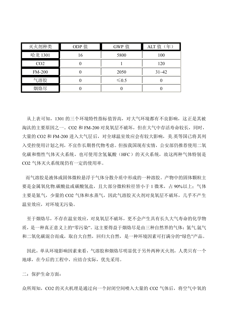 现行哈龙替代物的综合评述吴平摘要:本文通过对C02.FM-200.气溶胶.烟烙尽等四种灭火剂各项性能综合分析,使我们对它们有一个较全面的认识,为大家的设计使用提供一些参考。关键词:烟烙尽,气溶胶,臭氧层,温室效应,灭火剂随着哈龙1301替代物开发研究的不断深入,人们对替代物的认识也逐步加深,各类新型替代产品不断面世。但在我国,就目前技术上比较成熟,各种性能相对合理,符合我国现行《建筑设计防火规范》.《高层民用建筑设计防火规范》和其他相关法规要求,且具有实际推广价值而言,则是二氧化碳(CO2).FM-200(七氟丙烷).气溶胶.烟烙尽(NERGEN)等四种产品。过去人们对1301是推崇备至的,其优异的灭火性能为保卫祖国四化建设成果发挥了巨大的作用。但其分子中含有的溴.氯元素对臭氧层的破坏严重影响了人类的健康和人类赖以生存的地球环境,使人们不得不将它淘汰。那么,现行的这四种哈龙替代物性能如何,与1301相比,优势何在?保护生命,保护财产,保护环境是现代消防系统的三个要求。我们就以此为基准,对C02.FM-200.气溶胶.烟烙尽等四种替代产品从以下六个方面进行综合评述。一:保护环境方面通常情况下,评定一种灭火剂对大气破坏的环境指标有三项:1:对臭氧层(O3)不破坏,即臭氧耗损潜能值(ODP)为零。2:不产生温室效应或温室效应不明显,即全球温室效应值(GWP)为零或很小。3:合成物在大气中的存活寿命要短,即在大气中的存留时间(ALT)越小越好。这几种灭火剂的环境特性参数如下:
