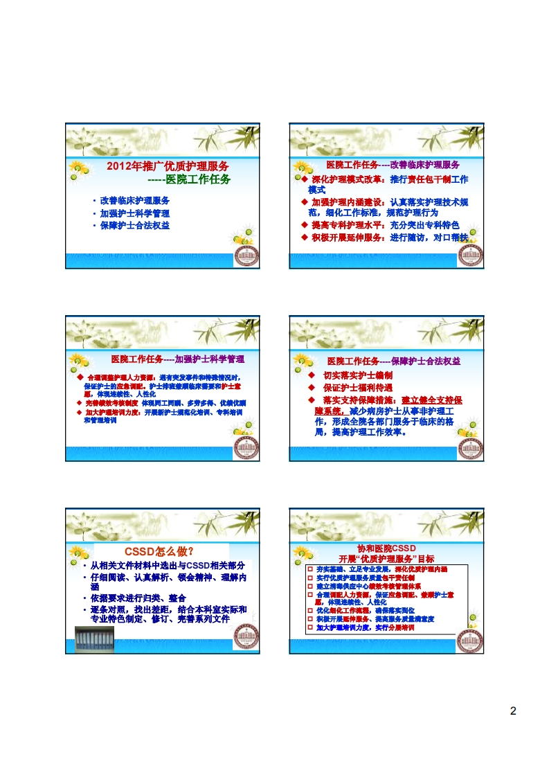 秀不新医院消毒供应中心优质护理服务与质量安全管理今日内容分享播建腿料大季附属协和医院C图DCSSD优质护理服务Email:zhangxcxiehe@126.com◆CSSD质量安全管理背景背景D2011年12010年:工浩势除腾發护康卫生部办公关于印发《2010年优质速务示工程"活功方来》卫办愿袁投〔2010)13号)国所有三绿医洗必须全部开漫优质护康务梧动目标:患者满意、社会浦清建、童府清律0老紧9务先进个人"40%的第市接二级医陕有20%的县最二最医院开晨优虎8有200所三医陕优质护建康不背景2012年卫生部●日2012年,优质护理服务的重点推广科室卫生都办公厅关于印发《2012年准广优质护爆务工作方)的知卫办厦政授(2012】47号·手术室活动目标,2012年全国所三量医院优质护60%以上的·门急诊·消毒供应中心,60%的地(市)额二领医壳和30%的县额腰澳开晨优○质护务·医技科室1