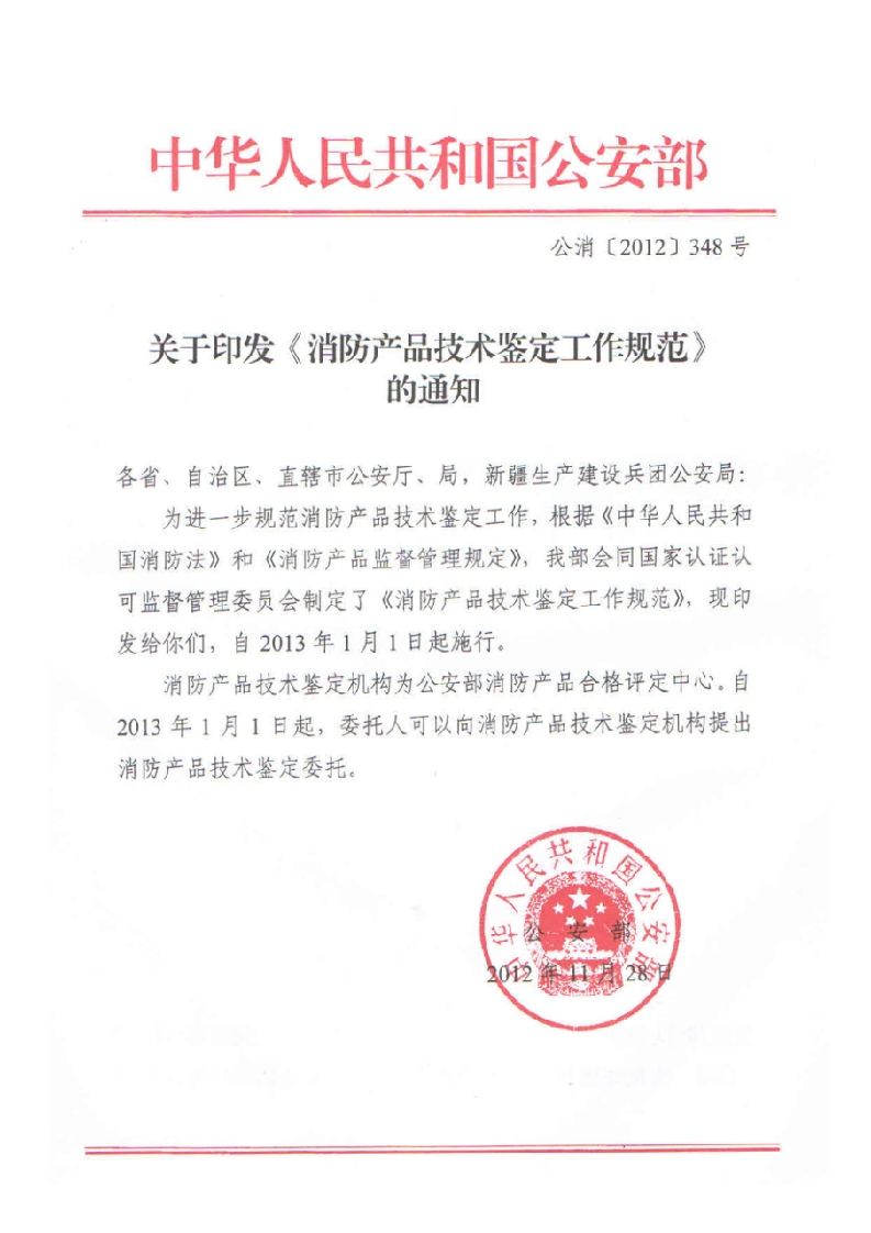 中华人民共和国公安部公消〔2012]348号关于印发《消防产品技术鉴定工作规范》的通知各省、自治区、直辖市公安厅、局,新疆生产建设兵团公安局:为进一步规范消防产品技术鉴定工作,根据《中华人民共和国消防法》和《消防产品监督管理规定》,我部会同国家认证认可监督管理委员会制定了《消防产品技术鉴定工作规范》,现印发给你们,自2013年1月1日起施行。消防产品拉术鉴定机构为公安部消防产品合格评定中心。自2013年1月1日起,委托人可以向消防产品技犬鉴定机构提出消防产品技术鉴定委托。25