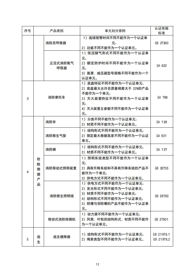 附件消防装备产品强制性认证单元划分及认证依据标准序号产品类别单元划分原则认证依据标准1)面罩、供气阀、减压器、警报器生产厂不同不能作为一个认证单元,型号规格不同不1正压式消防空气呼吸器能作为一个认证单元:GA1242)功能不同的产品不能作为一个单元:3)装配工艺不同的产品不能作为一个单元。1)结构形式不同不能作为一个认证单元:消防头盔2)帽壳、面罩材料不同不能作为一个认证单GA 44消防员灭火防护头套头套材料不同不能作为一个认证单元。GA8691)结构款式不同不能作为一个认证单元:2)外层材料不同不能作为一个认证单元:消防员灭火防护服3)防水透气层材料不同不能作为一个认证单GA 10元4)隔热层材料不同不能作为一个认证单元。消1)外层材料不同不能作为一个认证单元:防消防员隔热防护服2)隔热层材料不同不能作为一个认证单元:3)隔热服结构款式不同不能作为一个认证单GA634员元。个1)级别不同不能作为一个认证单元:消防员化学防护服装2)材料不同不能作为一个认证单元:GA7702人3)结构形式不同不能作为一个认证单元。防1)类别不同不能作为一个认证单元:2)外层材料不同不能作为一个认证单元:护消防手套GA 73)防水层材料不同不能作为一个认证单元;装4)隔热层材料不同不能作为一个认证单元。备消防员灭火防护靴材料不同不能作为一个认证单元GA 6消防腰斧材质不同不能作为一个认证单元。GA630安全绳安全带安全钩上升器1)类型不同不能作为一个认证单元:抓绳器2)结构形式不同不能作为一个认证单元:GA4943)材料不同不能作为一个认证单元。便携式固定装置下降器滑轮装置11