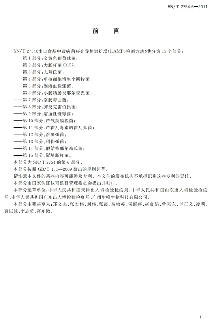SN中华人民共和国出入境检验检疫行业标准SN/T2754.6-2011出口食品中致病菌环介导恒温扩增(LAMP)检测方法第6部分:小肠结肠炎耶尔森氏菌Loop-mediated isothermal amplification detection method for pathogensin export food-Part 6:Yersinia enterocolitica2011-02-25发布2011-07-01实施中华人民共和国国家质量监督检验检疫总局发布