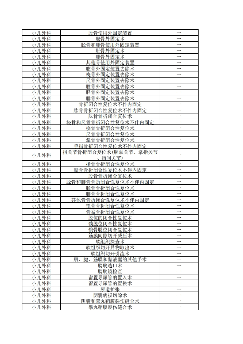 小儿外科手术分级管理目录科室名称手术操作名称手术级别小儿外科肠造口指检小儿外科直肠指检小儿外科颈椎牵引术小儿外科皮牵引小儿外科颈托固定小儿外科其他石音管型的应用小儿外科石音绷带固定小儿外科夹板外固定小儿外科石膏托固定术小儿外科外固定架固定小儿外科嵌塞粪便去除小儿外科导尿管冲洗小儿外科清洁伤口小儿外科鼻-胃管置换小儿外科石音置换小儿外科外固定置换小儿外科置换伤口填塞或引流物小儿外科去除肾孟造口和肾造口导管小儿外科导尿管去除一小儿外科外固定装置取出术小儿外科石音外固定去除小儿外科去除其他治疗性装置一小儿外科缝线去除小儿外科阴茎异物去除小儿外科阴囊异物去除小儿外科躯干其他异物不切开去除,除外阴囊,阴茎或一外阴小儿外科手异物去除小儿外科上肢异物的不切开去除,除外手小儿外科足异物去除小儿外科下肢异物的不切开去除,除外足小儿外科红光治疗一小儿外科胸腔闭式引流术小儿外科胸壁活组织检查小儿外科胸壁裂伤缝合术小儿外科胸壁清创缝合术小儿外科胸腔穿刺抽液术小儿外科胸腔穿刺抽气术小儿外科使用外固定装置小儿外科锁骨外固定术小儿外科肱骨使用外固定装置一小儿外科肱骨外固定术小儿外科桡骨和尺骨使用外固定装置小儿外科桡骨外固定术小儿外科尺骨外固定术一