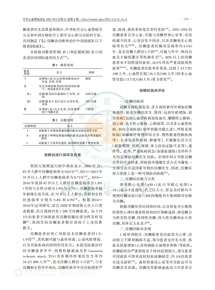 ·572·中华心血管病杂志2023年6月第51卷第6期Chin J Cardiol.June2023.Val.5L,Na.6·指南与共识·心房颤动诊断和治疗中国指南中华医学会心血管病学分会中国生物医学工程学会心律分会道信作者:马长生,Email::chshma@vip.sina.com;吴书林,Email:doctorwushulin@l63.com;刘少稳,Email:shaowen.liu@hotmail.com;韩雅玲,Email:hanyaling(@263.net【摘要】心房颤动(房颤)是最常见的持续性心律失常,严重影响患者生活质量,显著增加死亡卒中、心力衰竭和痴呆风险。过去二十年在房颤风险预测与筛查诊断、卒中预防、节律控制、导管消融和综合管理等方面取得了一系列突破性进展,这一时期我国房领管理的规模、质量和经验也得到了大幅度提升,为制定房颤诊断和治疗指南提供了坚实的基黜。为进一步推动房颤规范化管理,及时、充分地将新技术新理念应用于临床实践,中华医学会心血管病学分会和中国生物医学工程学会心律分会组织专家,共同制定了《心房颤动诊断和治疗中国指南》。该指南详尽阐述了房颤管理的各个环节,并根据亚洲房颤人群特点提出了CHA,DS,-VASc--60卒中评分,重新评价了房颤筛查的临床应用,强调了早期节律控制的意义和导管消融在节律控制中的核心地位。【关键词】心房颤动;抗凝;节律控制:导管消融;综合管理Chinese guidelines on diagnosis and management ofatrial fibrillationChinese Society of Cardiology,Chinese Medical Association;Heart Rhythm Committee ofChinese Societyof Biomedical EngineeringCorresponding author:Ma Changsheng,Email:chshma@vip.sina.com;Wu Shulin,Email:doctorwushulin@163.com;Liu Shaowen,Email:shaowen.liu@hotmail.com;Han Yaling,Email:hanyaling@263.net心房颤动(房颤)是最常见的持续性心律失常,律控制的一线治疗手段,可减少房颤发作,改善生显著增加死亡、卒中、心力衰竭(心衰)认知功能障活质量,延缓房颤从阵发性进展为持续性],改善碍和痴呆风险,严重影响患者生活质量。房颤房颤合并心衰患者的预后9。对于诊断1年之内患病率随年龄增长而增加,随着人口老龄化进程的房颤,节律控制策略在改善预后方面优于室率控加速,房颤将给社会和医疗服务系统带来沉重的负制策略。器械与技术进步大幅降低了经皮左心担。过去二十年在房颤风险预测与筛查诊断、卒中耳封堵(left atrial appendage closure,LAAC)的操作预防、节律控制、导管消融和综合管理等方面取得难度与并发症发生率。新的循证医学证据不断了一系列突破性进展。非维生素K拮抗剂口服抗产生,新的技术和理念,如可穿戴设备、远程医疗和(non-vitamin-K-antagonist oral anticoagulants,人工智能技术的应用,正在为房颤管理带来重大变NOAC)的应用彻底改变了华法林抗凝治疗的格革。以上进展为制定房颤诊断和治疗指南提供了局,房颤人群的抗凝率显著提升,卒中风险不断降充实的依据。低),而更新一代口服抗凝药Ⅺ因子抑制剂在预防我国房颤管理的规模、质量和经验在这一时期血栓的同时,出血风险更低,很有希望为房颤抗凝也得到了大幅度提升。为进一步推动房颤管理新领域带来新的革命。导管消融逐渐成为房颤节技术和新理念及时、充分应用于临床实践,改善房D0L:10.3760/cma-j.cm112148-20230416-00221收稿日期2023-04-16本文编辑范妹婕引用本文:中华医学会心血管病学分会,中国生物医学工程学会心律分会.心房颤动诊断和治疗中国指南中华心血管病杂志,2023,51(6)572-618.D01:10.3760cmaj.cml12148-20230416-00221.