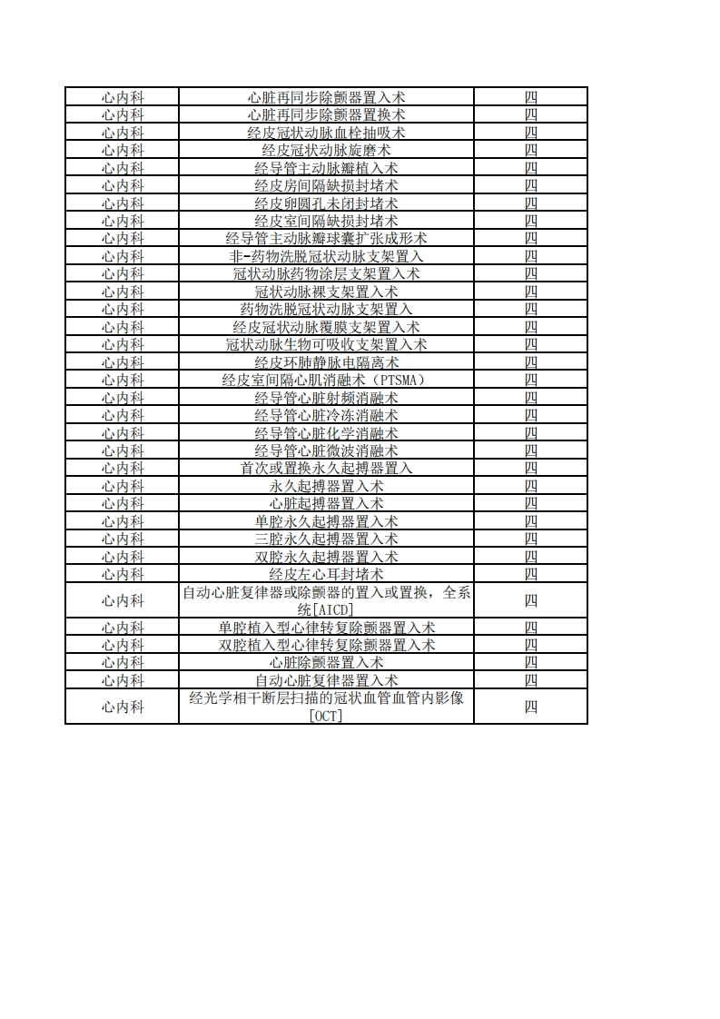 心内科手术分级管理目录科室名称手术操作名称手术级别心内科人工起搏器电极阻抗检查心内科人工起搏器电压或电流阈值检查一心内科心脏起搏器囊袋清创术二心内科主动脉球囊反搏装置去除[IABP装置去除]心内科冠状动脉血管内压力测量三心内科冠脉微循环阻力指数检查[IMR检查]三心内科冠脉瞬时无波形比值检查[FR检查]三心内科冠状动脉血流储备分数检查三心内科经皮冠状动脉腔内血管成形术[PTCA]三心内科经皮冠状动脉球囊扩张成形术三心内科经皮冠状动脉药物球囊扩张成形术三心内科经皮肾动脉去交感神经射频消融术三心内科经皮球囊瓣膜成形术心内科经导管肺动脉瓣球囊扩张成形术三心内科经导管三尖瓣球囊扩张成形术三心内科经导管二尖瓣球囊扩张成形术三心内科冠状动脉内血栓溶解药输注三心内科主动脉球囊反搏置入术三心内科心脏起搏器电极调整术三心内科暂时性经静脉起搏器系统的置入三心内科心脏起搏器囊袋修补术三心内科永久起搏器置换术三心内科三腔永久起搏器置换术三心内科双腔永久起搏器置换术三心内科心脏除颤器置换术三心内科自动心脏复律器置换术三心内科单腔植入型心律转复除颤器更换术三心内科双腔植入型心律转复除颤器更换术三心内科经皮动脉导管未闭封堵术三心内科左心室造影三心内科单根导管的冠状动脉造影术三心内科单根导管冠状动脉搭桥术后桥血管造影三心内科用两根导管的冠状动脉造影术三心内科两根导管冠状动脉搭桥术后桥血管造影三心内科多根导管冠状动脉搭桥术后桥血管造影三心内科多根导管冠状动脉造影三心内科经食道心脏调搏术三心内科心电生理检查三心内科冠状血管的血管内显像四心内科冠状动脉血管内超声(IVUS)四心内科心脏再同步起搏器置入未提及去除心脏纤颤,全系统[CRT-P]四心内科心脏再同步起搏器置入术四心内科心脏再同步起搏器置换术四心内科心脏再同步除颤器置入,全系统[CRT-D]四