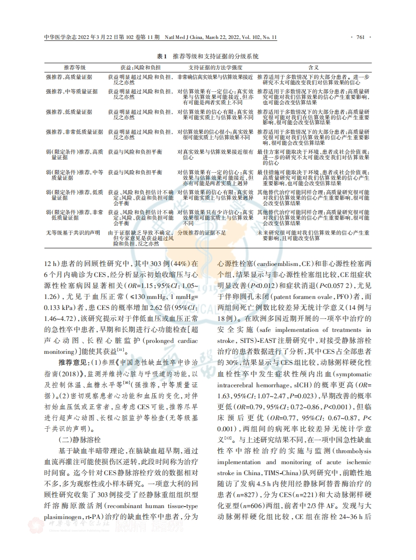 ·760·中华医学杂志2022年3月22日第102卷第11期Natl Med』Cdhi,Marh22,2022,Val.102.No.11·标准与规范·心源性卒中治疗中国专家共识(2022)中华医学会老年医学分会老年神经病学组北京神经科学学会血管神经病学专业委员会心源性卒中治疗中国专家共识组通信作者:刘广志,首都医科大学附属北京安贞医院神经内科,北京100029,Email:guangzhi.2002@hotmail.com;胡荣,首都医科大学附属北京安贞医院心脏中心,北京100029,Email:huronggg(@126.com;彭丹涛,中日友好医院神经内科,北京100029,Email:pengdantao@medmail.com.cn【摘要】心源性栓塞性卒中(CS),简称心源性卒中,是指来自心脏和主动脉弓的栓子通过循环导致脑动脉栓塞引起相应脑功能障碍的临床综合征。与其他病因所致的缺血性卒中相比,心源性卒中的病因更复杂、病情程度相对更重、预后更差。本共识主要依据其病因与发病机制制订治疗方案,在急性期应密切观察患者心功能和血压的变化,治疗时间窗内推荐静脉溶栓和(或)血管内治疗,并予以抗血小板或抗凝、他汀治疗,以尽可能最大程度地挽救缺血半暗带,减少神经功能残疾;针对CS的不同病因采取相应的治疗措施,包括药物、外科和介入治疗,以预防卒中复发,并积极进行神经康复治疗。【关键词】卒中;心源性栓塞性卒中;溶栓治疗;抗凝剂;心脏外科手术心源性栓塞性卒中(cardioembolic stroke,血管内治疗,以尽可能最大程度地挽救缺血半暗CES),简称心源性卒中,是指来自心脏和主动脉弓91带,减少神经功能残疾:针对CES的不同病因采取的栓子通过循环导致脑动脉栓塞引起相应脑功能相应的治疗措施,以预防卒中的复发,并积极进行障碍的临床综合征。与其他病因所致的缺血性卒CA神经康复治疗。治疗方案的推荐等级和证据水平中相比,CS的病因更复杂、病情程度相对更重、预根据表1所列的标准加以衡量和分级,由撰写组后更差、复发率更高。CES多存在明确的心脏疾全体成员起草、表决和修订了分级建议和无等级基病或危险因素,其中由心房颤动(atrial fibrillation,于共识的声明,直至达成共识。AF)所致者约占70%,近年来对CES(如卒中高危一、急性期治疗AF)的防治虽有所进步41,但仍存在对其认识不遵循“时间就是大脑(time is brain)”的原则,尽足、治疗策略差异大等问题。鉴于以上问题,且可能在到达急诊室后60min内完成脑CT等基本评国内外尚无全面统一的CS治疗方案(尤其是急性估并开始治疗,应尽量缩短进院至溶栓治疗时间期),故共识制定组以国内外近年来的临床研究为(door-to-needle time,DNT),并酌情适时选择桥接uo依据,结合我国实际,制订本专家共识,以期更好地或直接机械取栓,以及抗血小板聚集、抗凝、降脂等规范CES治疗,进而提高CES的临床救治水平。治疗。本共识在以往诊断共识的基础上,根据CE$危(一)一般治疗险分层和特定的发病机制制订治疗方案。一般目前这部分的相关高等级研究证据较少,近期原则:在急性期治疗时间窗内进行静脉溶栓和(或)在加拿大一项纳入了683例急性缺血性卒中(≤D01:10.3760/cma.j.cm112137-20210712-01555收稿日期2021-07-12本文编辑朱蹈引用本文:中华医学会老年医学分会老年神经病学组,北京神经科学学会血管神经病学专业委员会,心源性卒中治疗中国专家共识组.心源性卒中治疗中国专家共识(2022)[.中华医学杂志,202210211:760-773.D01:10.3760ema-j.cnl12137-20210712-01555.